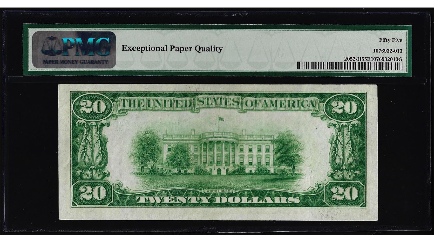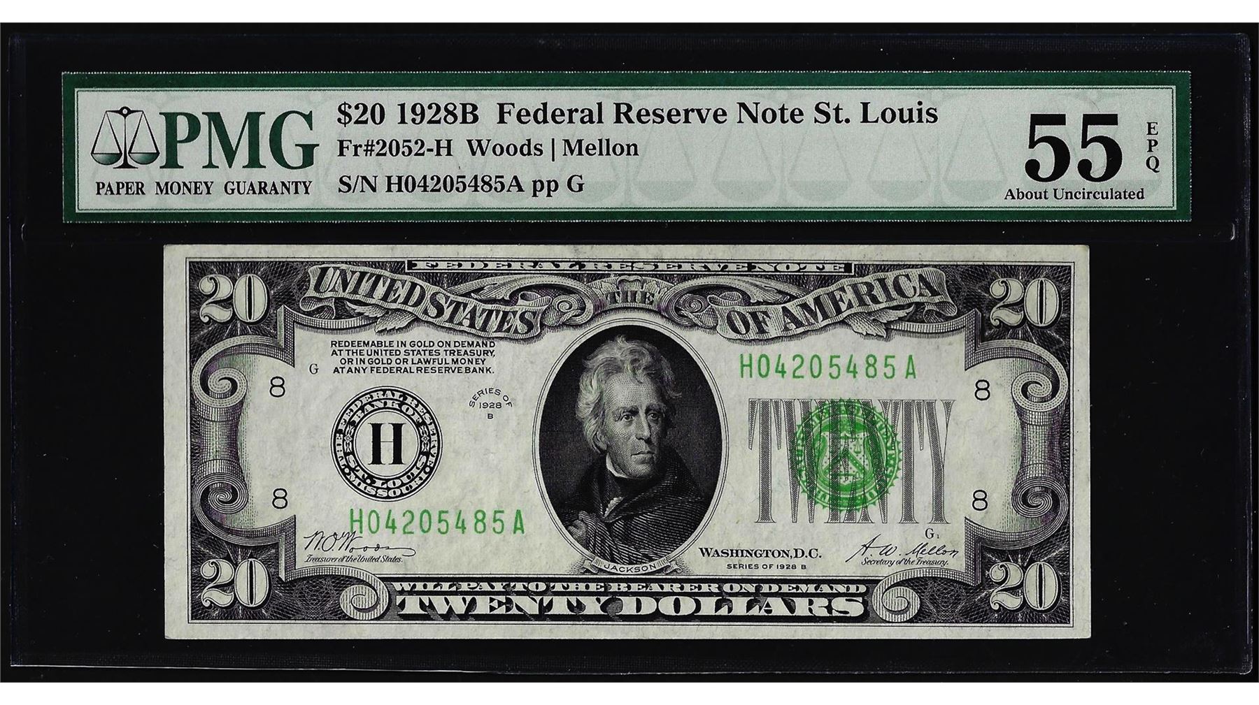 One 1928B $20 Federal Reserve Note St. Louis Fr.2052-H PMG About Uncirculated 55EPQ. PMG Certified.