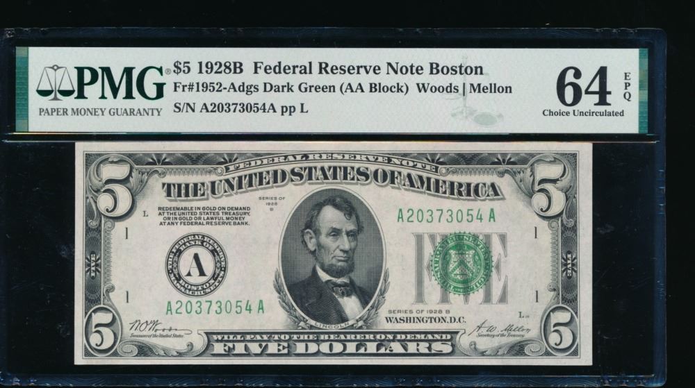 One 1928B $5 Boston FRN PMG 64EPQ.