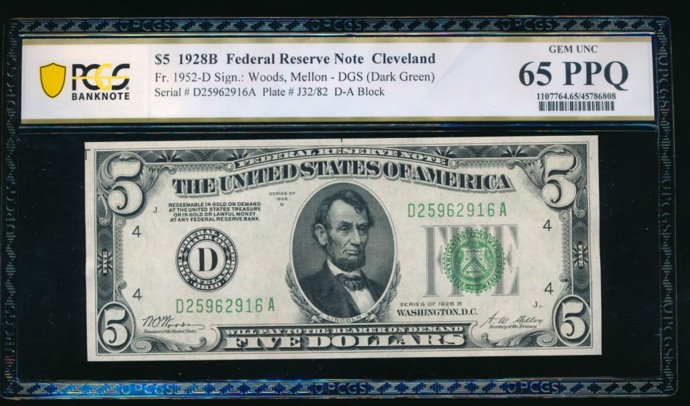 One 1928B $5 Cleveland FRN PCGS 65PPQ.