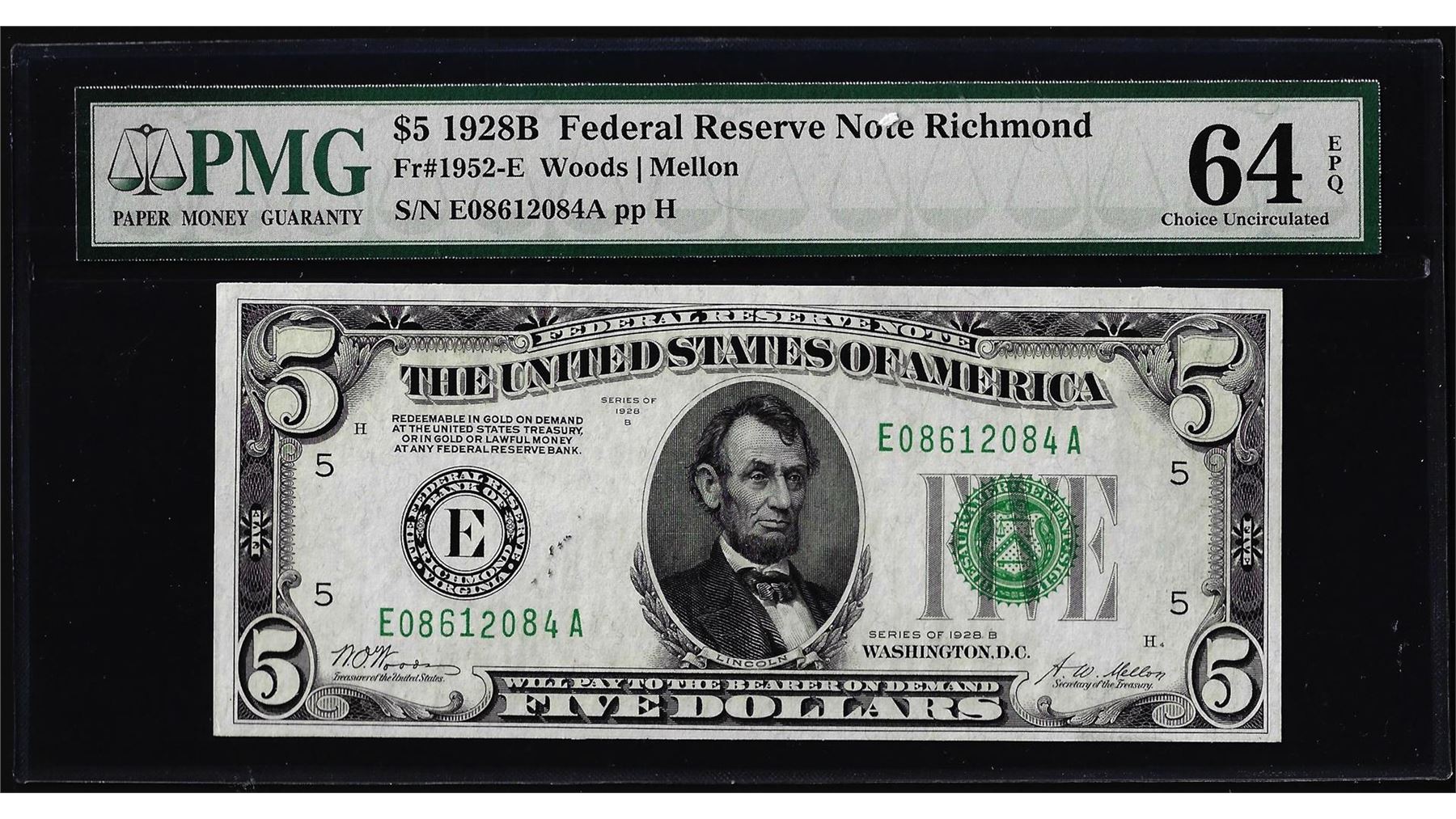 One 1928B $5 Federal Reserve Note Richmond Fr.1952-E PMG Choice Uncirculated 64EPQ. PMG Certified.