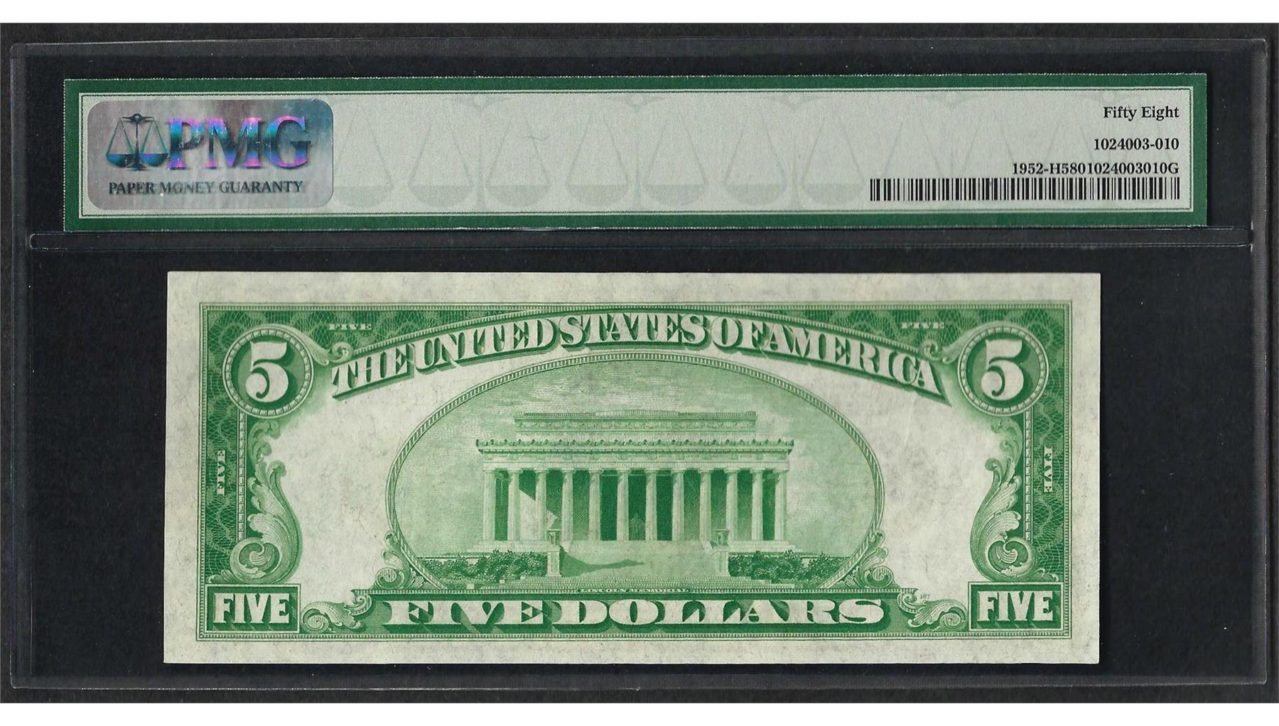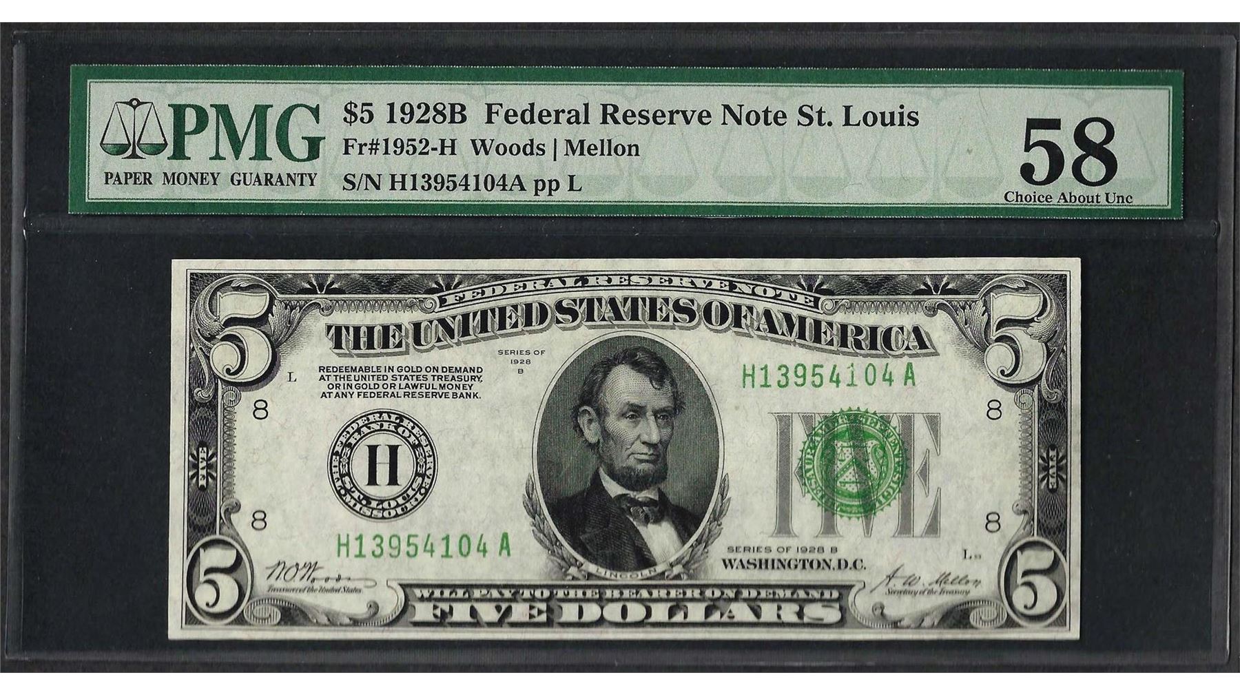 One 1928B $5 Federal Reserve Note St. Louis Fr.1952-H PMG Choice About Uncirculated 58. PMG Certified.