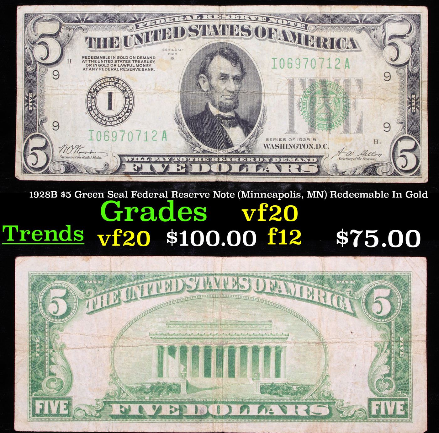 1928B $5 Green Seal Federal Reserve Note (Minneapolis, MN) Redeemable In Gold vf, very fine.