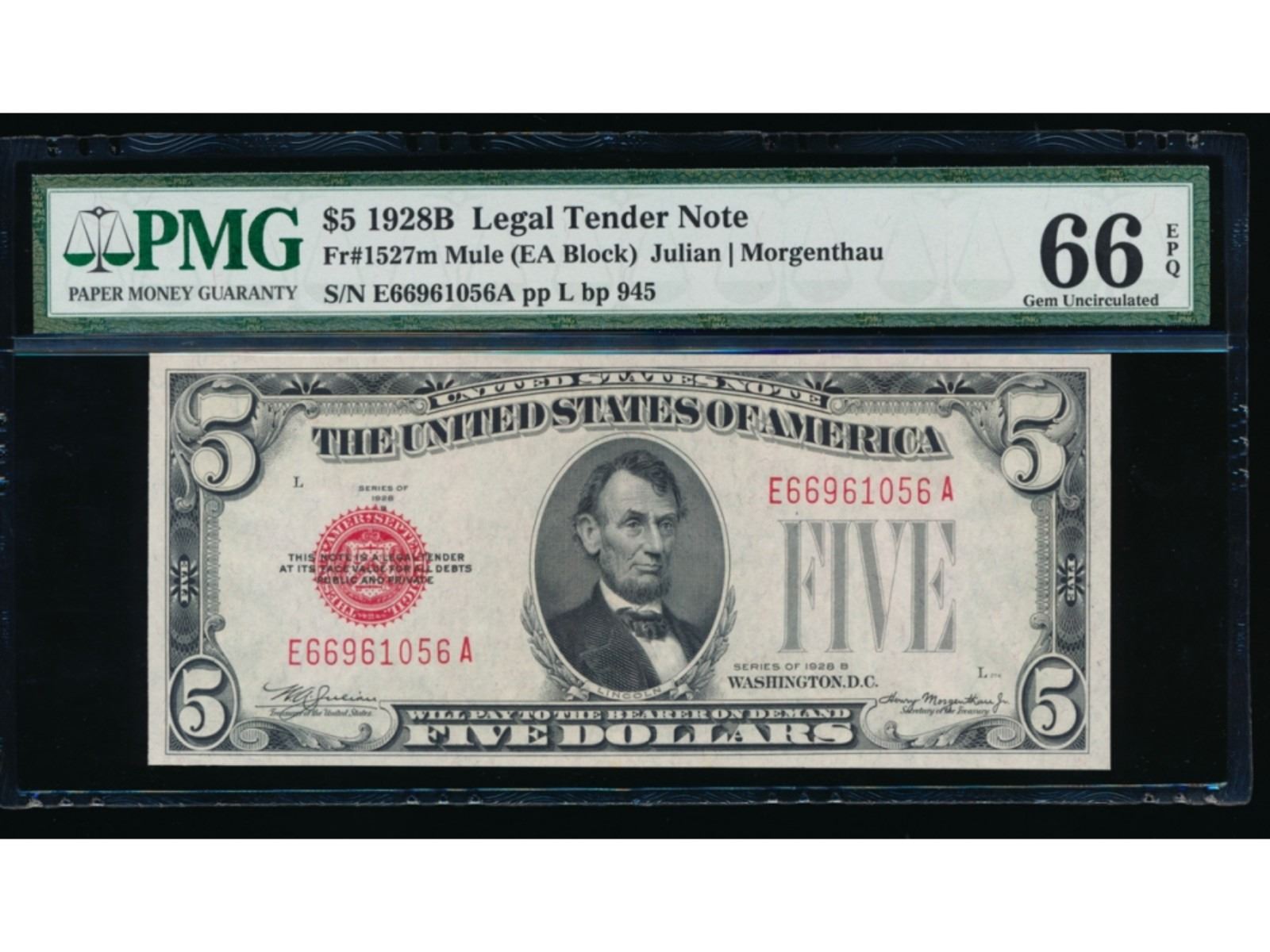 One 1928B $5 Legal Tender Mule Note PMG 66EPQ.