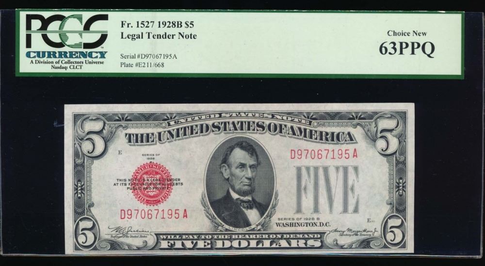 One 1928B $5 Legal Tender Note PCGS 63PPQ.