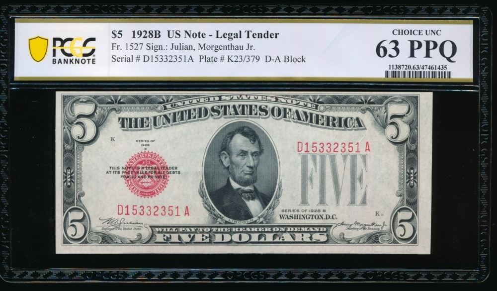 One 1928B $5 Legal Tender Note PCGS 63PPQ.