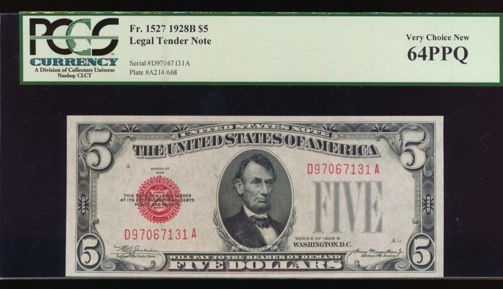 One 1928B $5 Legal Tender Note PCGS 64PPQ.