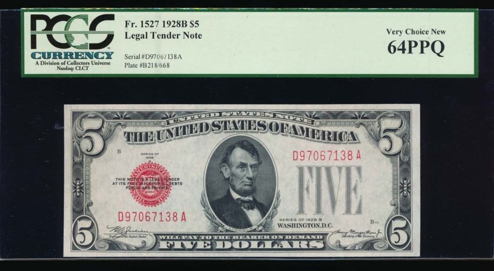 One 1928B $5 Legal Tender Note PCGS 64PPQ.