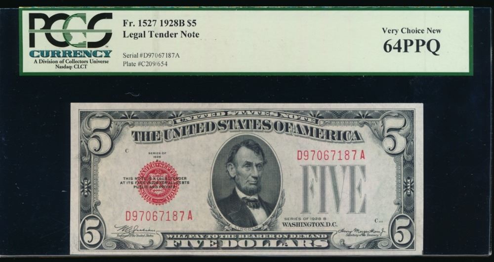 One 1928B $5 Legal Tender Note PCGS 64PPQ.