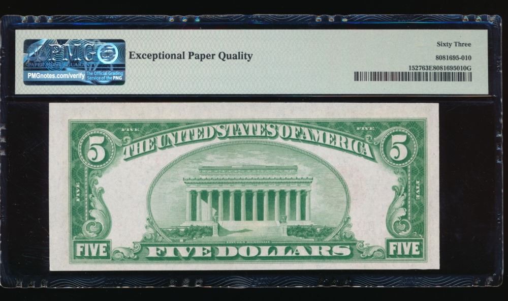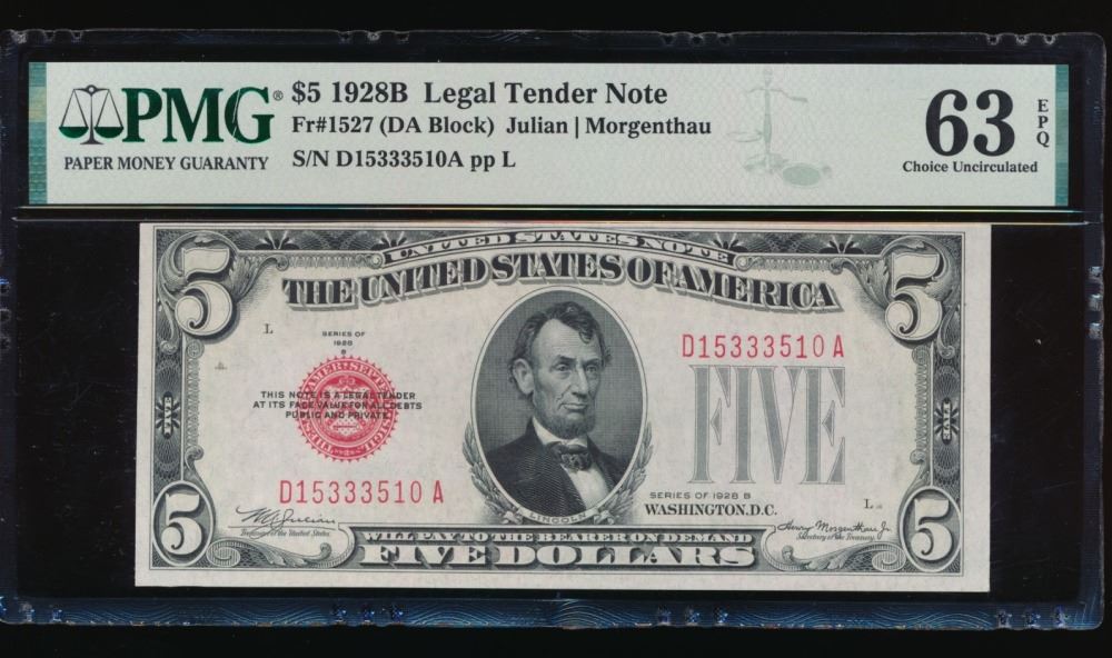 One 1928B $5 Legal Tender Note PMG 63EPQ.