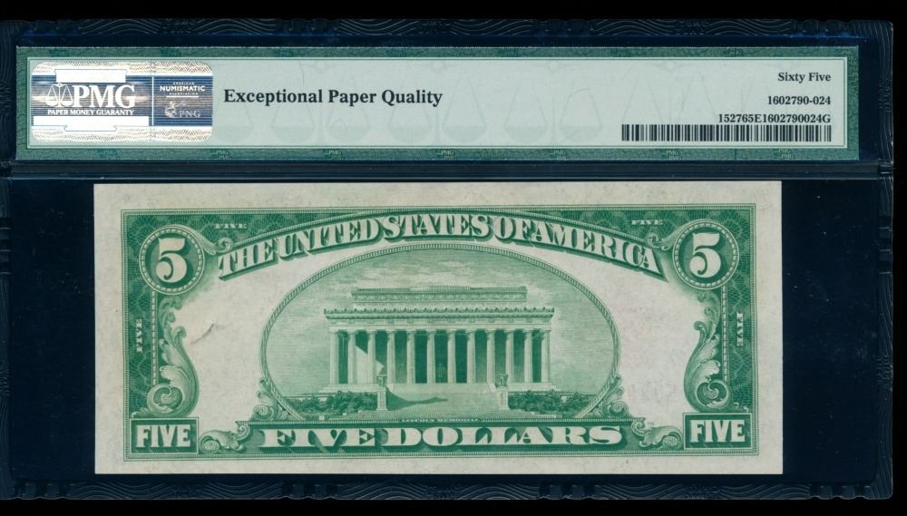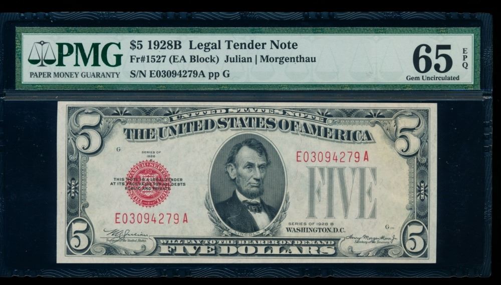 One 1928B $5 Legal Tender Note PMG 65EPQ.