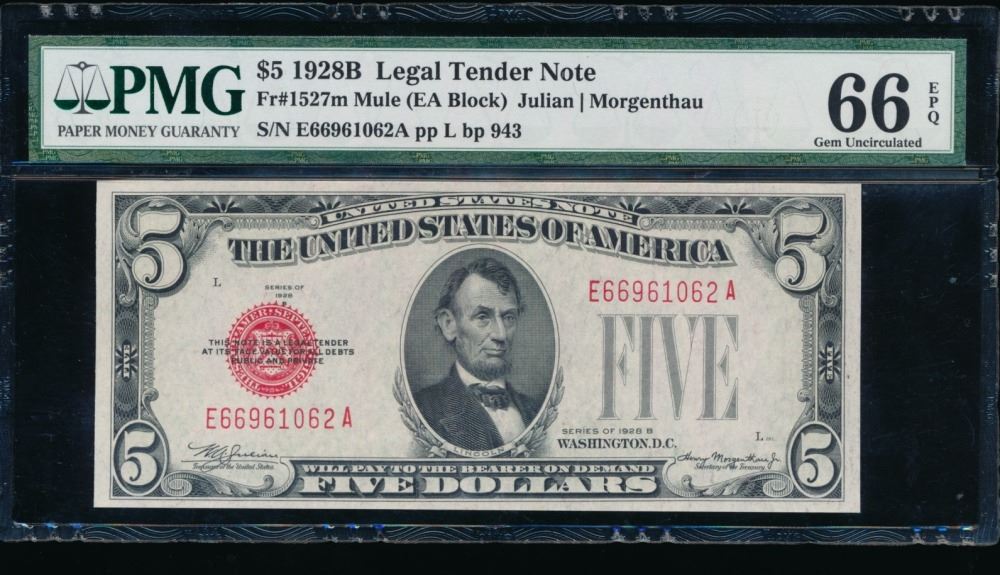 One 1928B $5 Mule Legal Tender Note PMG 66EPQ.