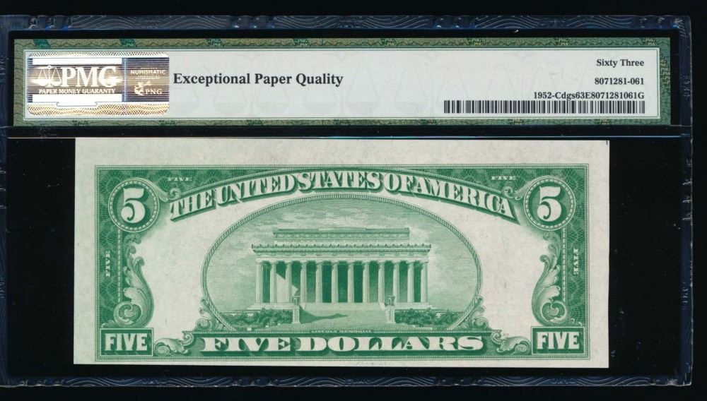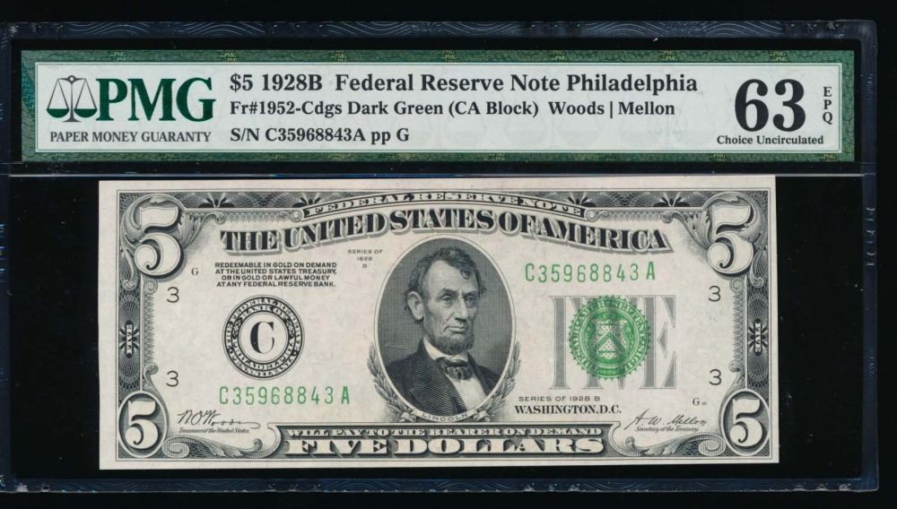 One 1928B $5 Philadelphia Federal Reserve Note PMG 63EPQ.