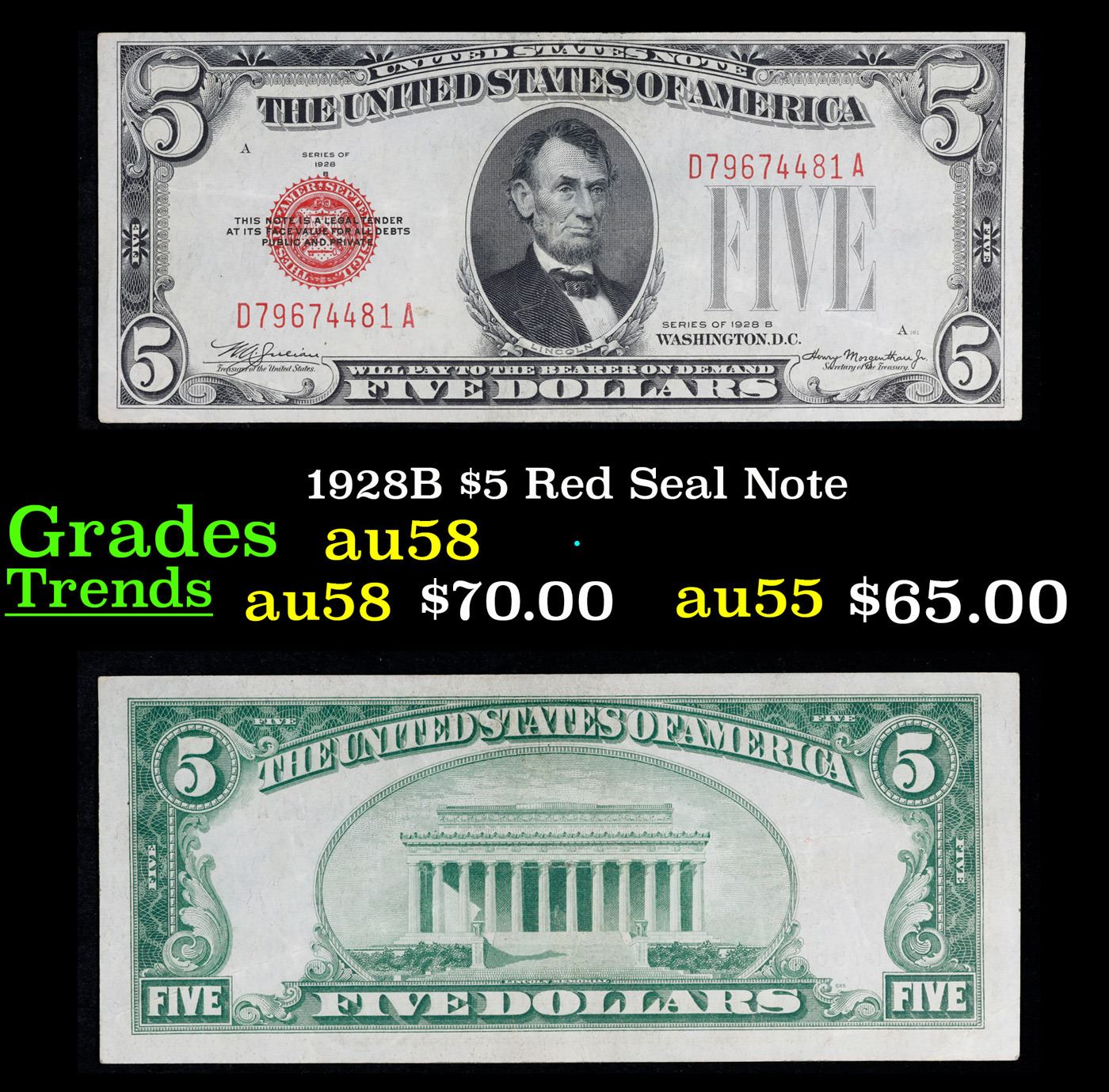 1928B $5 Red Seal Note Grades Choice AU/BU Slider.