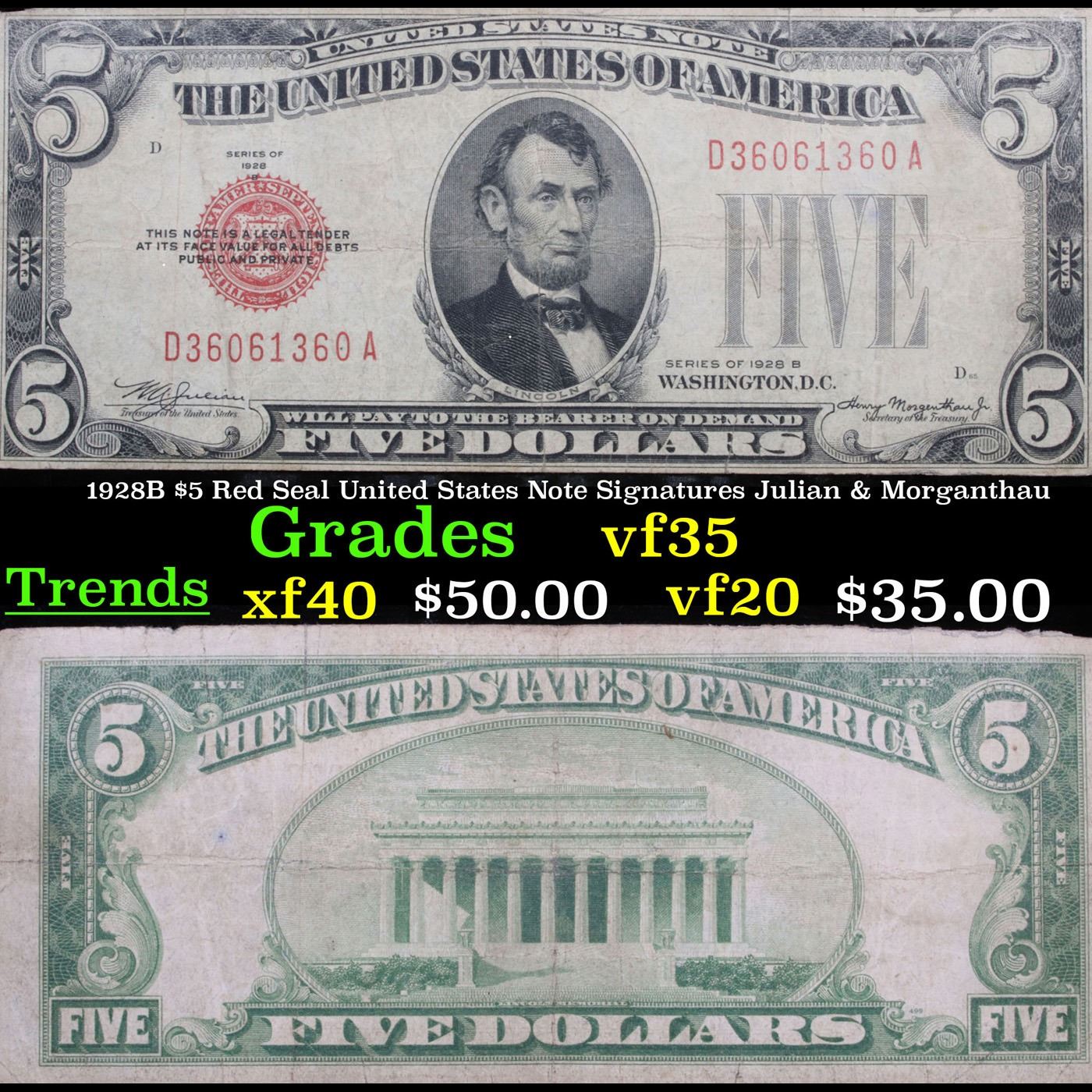 1928B $5 Red Seal United States Note Signatures Julian & Morganthau Grades vf++. 1928 five dollar red seals say 1928, but they were printed for many years past just 1928. 1928Fs were printed as late as the early 1950s. Some 1928 five dollar bills have different phrasings. However, all 1928 fives have a portrait of Abraham Lincoln. All bills have a red seal on the left hand side of the bill. They also have red inked writing used for the serial numbers.