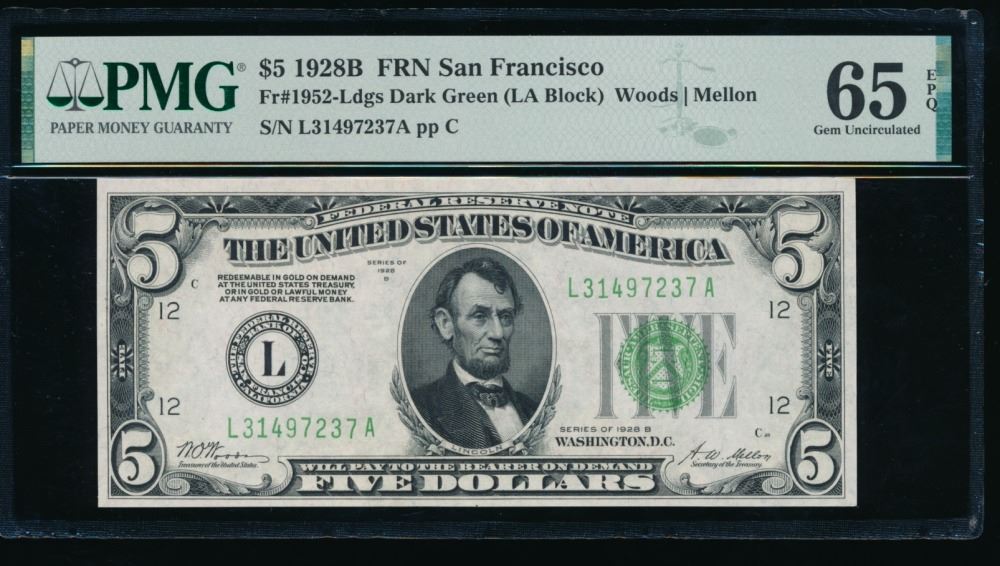 One 1928B $5 San Francisco FRN PMG 65EPQ.