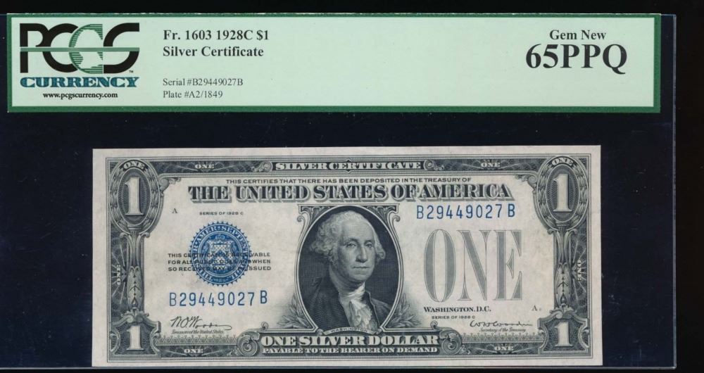 One 1928C $1 Silver Certificate PCGS 65PPQ.