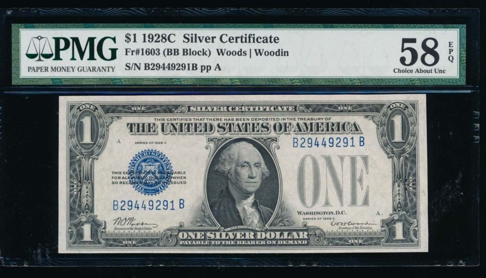One 1928C $1 Silver Certificate PMG 58EPQ.