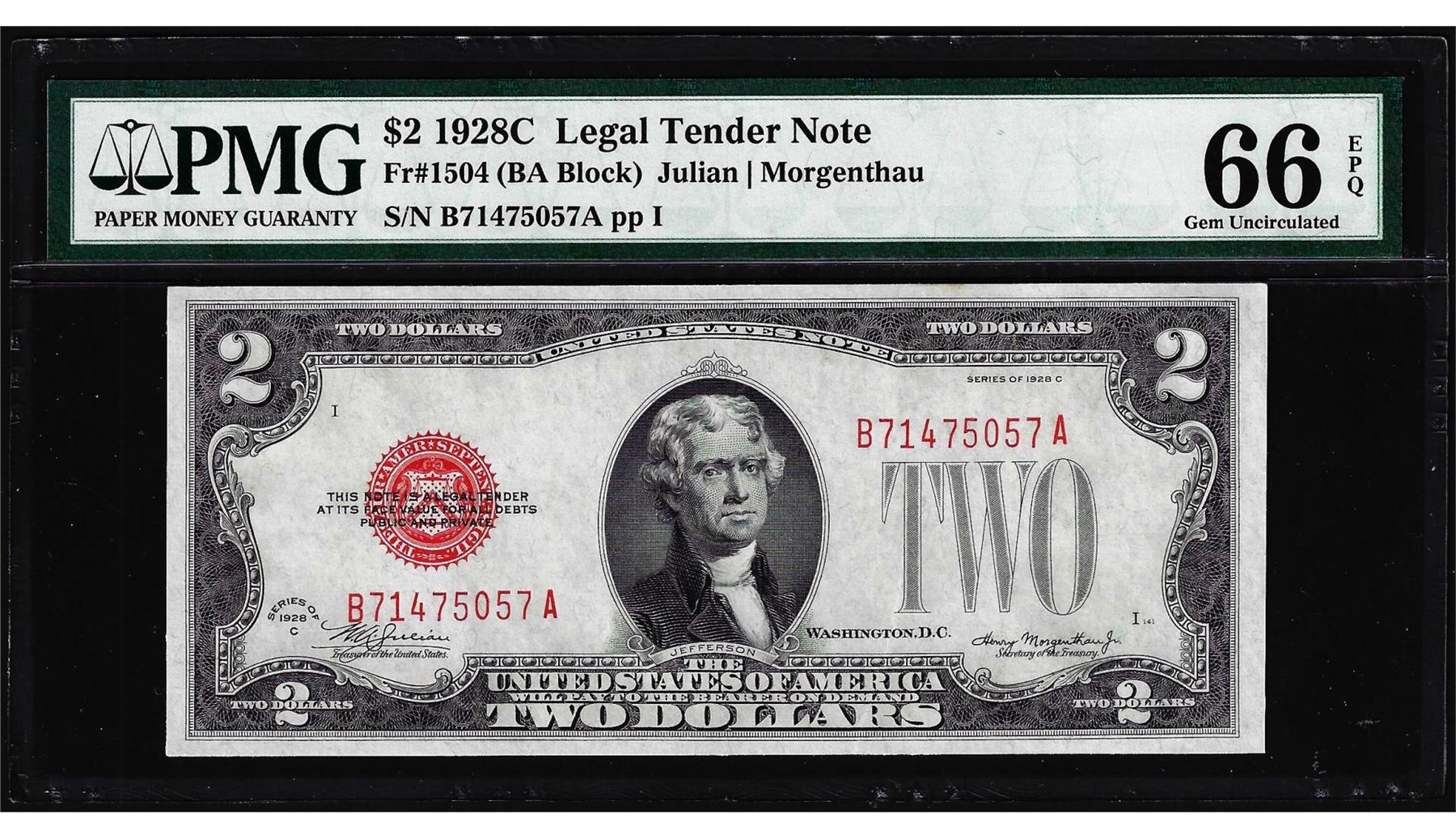 One 1928C $2 Legal Tender Note Fr.1504 PMG Gem Uncirculated 66EPQ. PMG Certified.