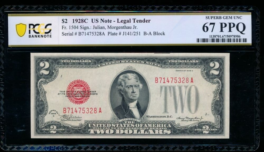 One 1928C $2 Legal Tender Note PCGS 67PPQ.