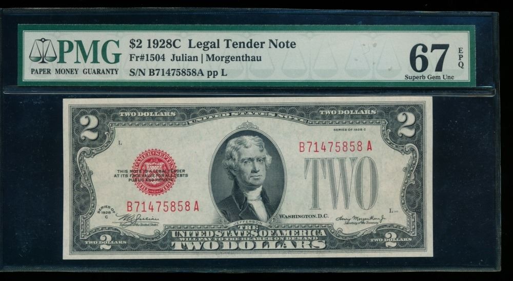 One 1928C $2 Legal Tender Note PMG 67EPQ.