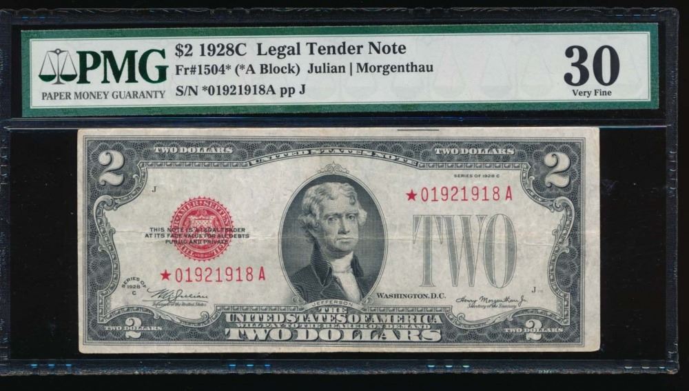 One 1928C $2 Legal Tender STAR Note PMG 30.