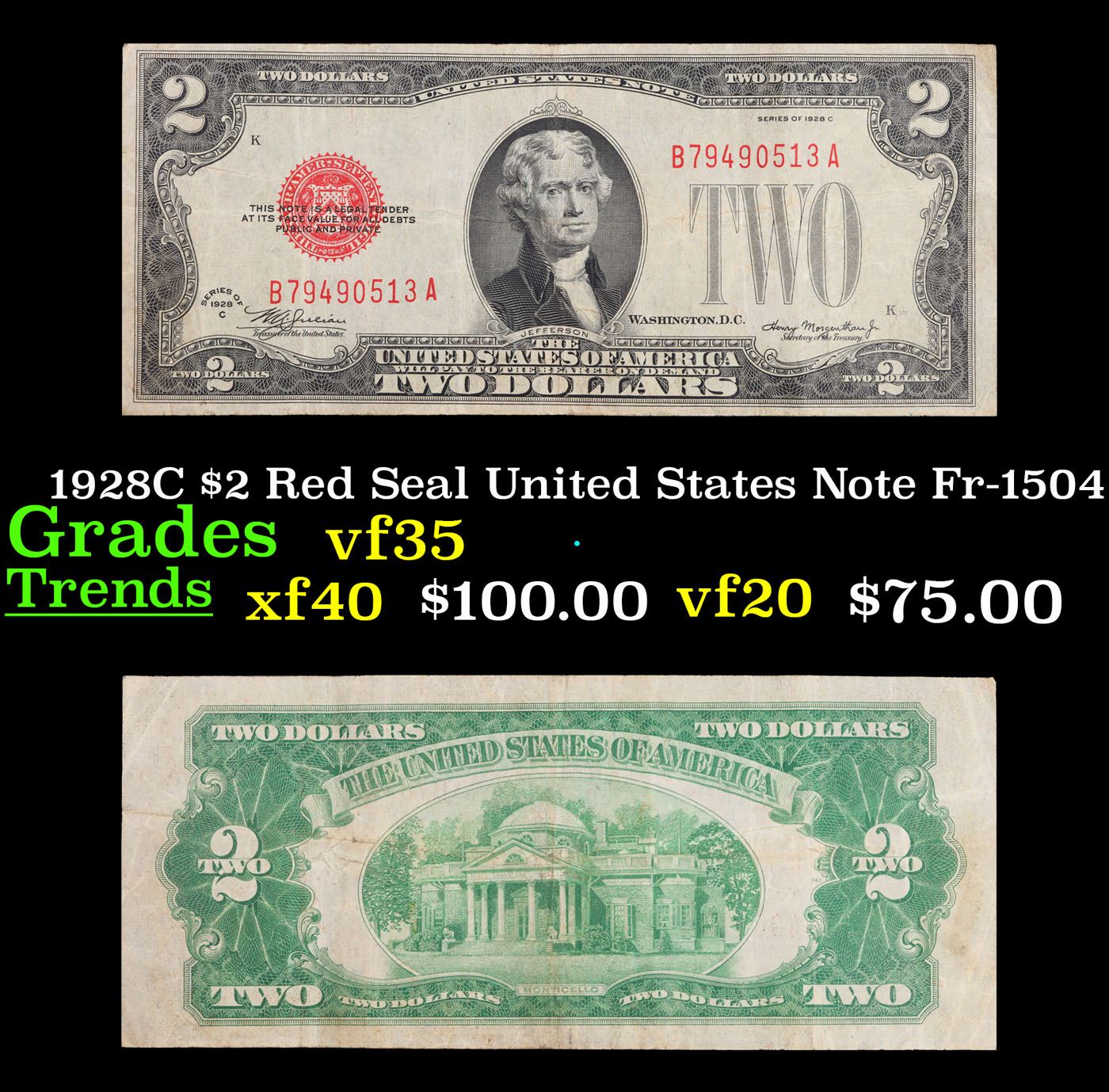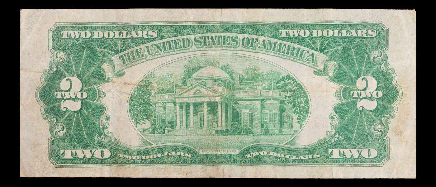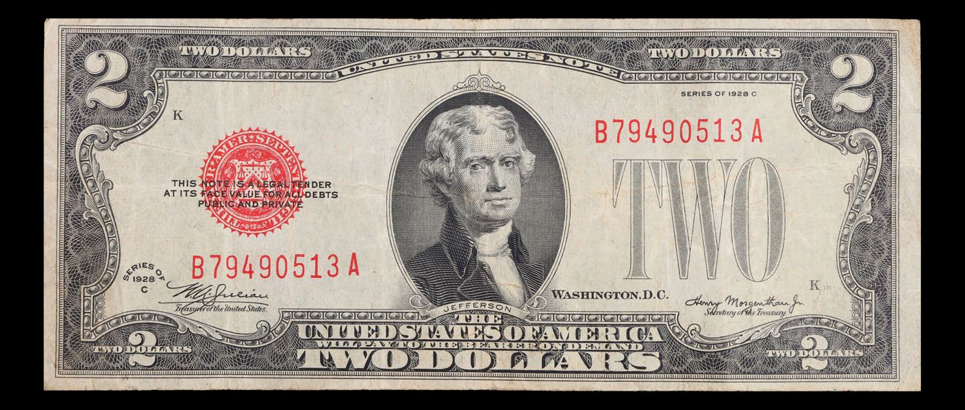 1928C $2 Red Seal United States Note Fr-1504 Grades vf++. This is the first “small size” two dollar bill issued by The U.S. In 1928 the size of paper money was changed to the size that we are familiar with today. There are eight different types of 1928 $2 bills. They are Series of 1928, Series of 1928A, 1928B, 1928C, 1928D, 1928E, 1928F, and 1928G. Series of 1928D $2 bills were printed in the later period between January 1934 and July 1944. These dates coincide with when Henry Morgenthau Jr. and WA Julian were in office together. Like all red seal two dollar legal tender notes, the series of 1928D $2 notes features Thomas Jefferson on the front and Monticello on the back.