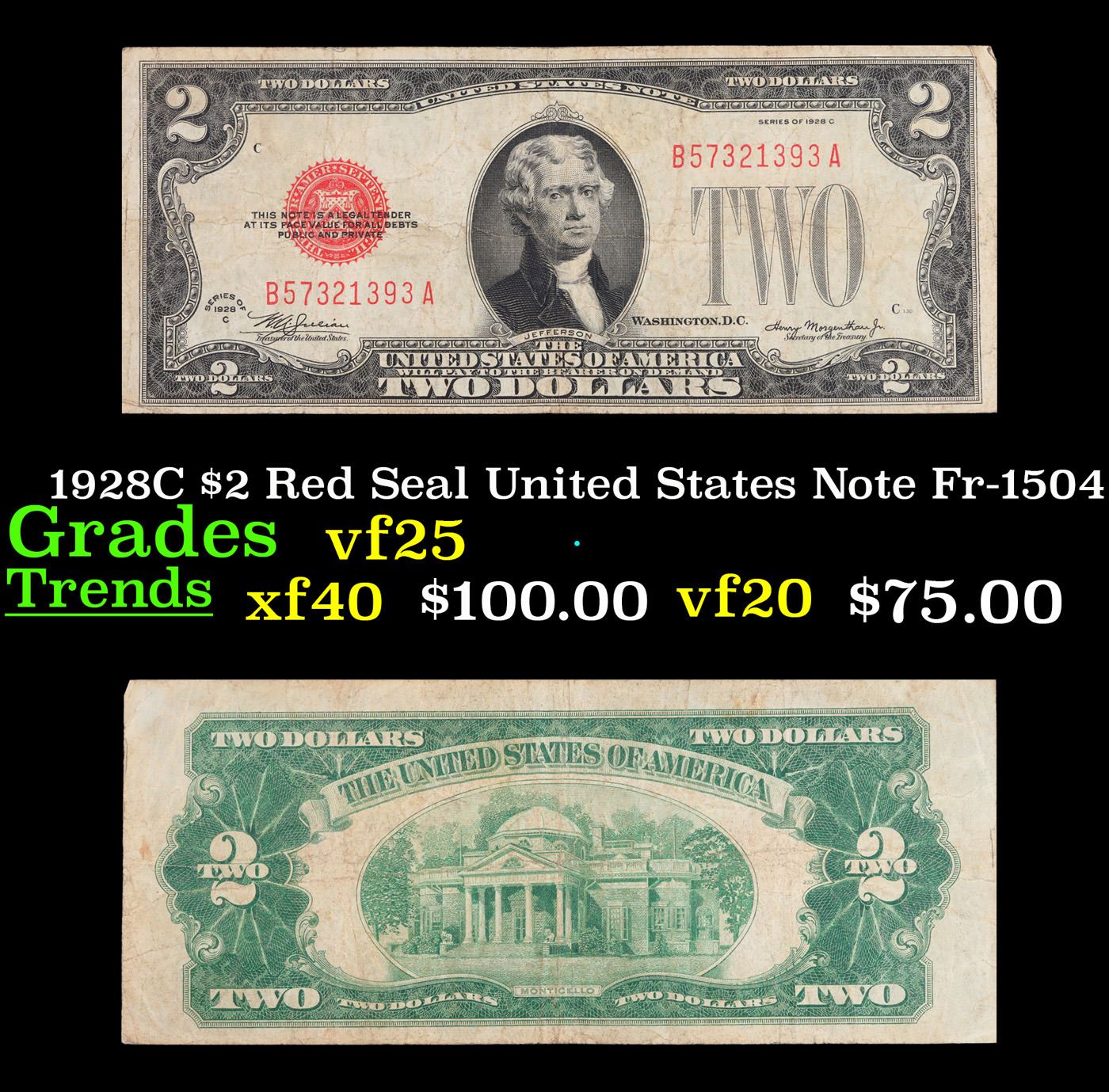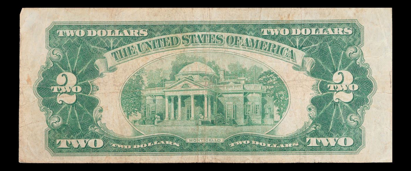 1928C $2 Red Seal United States Note Fr-1504 Grades vf+. This is the first “small size” two dollar bill issued by The U.S. In 1928 the size of paper money was changed to the size that we are familiar with today. There are eight different types of 1928 $2 bills. They are Series of 1928, Series of 1928A, 1928B, 1928C, 1928D, 1928E, 1928F, and 1928G. Series of 1928D $2 bills were printed in the later period between January 1934 and July 1944. These dates coincide with when Henry Morgenthau Jr. and WA Julian were in office together. Like all red seal two dollar legal tender notes, the series of 1928D $2 notes features Thomas Jefferson on the front and Monticello on the back.