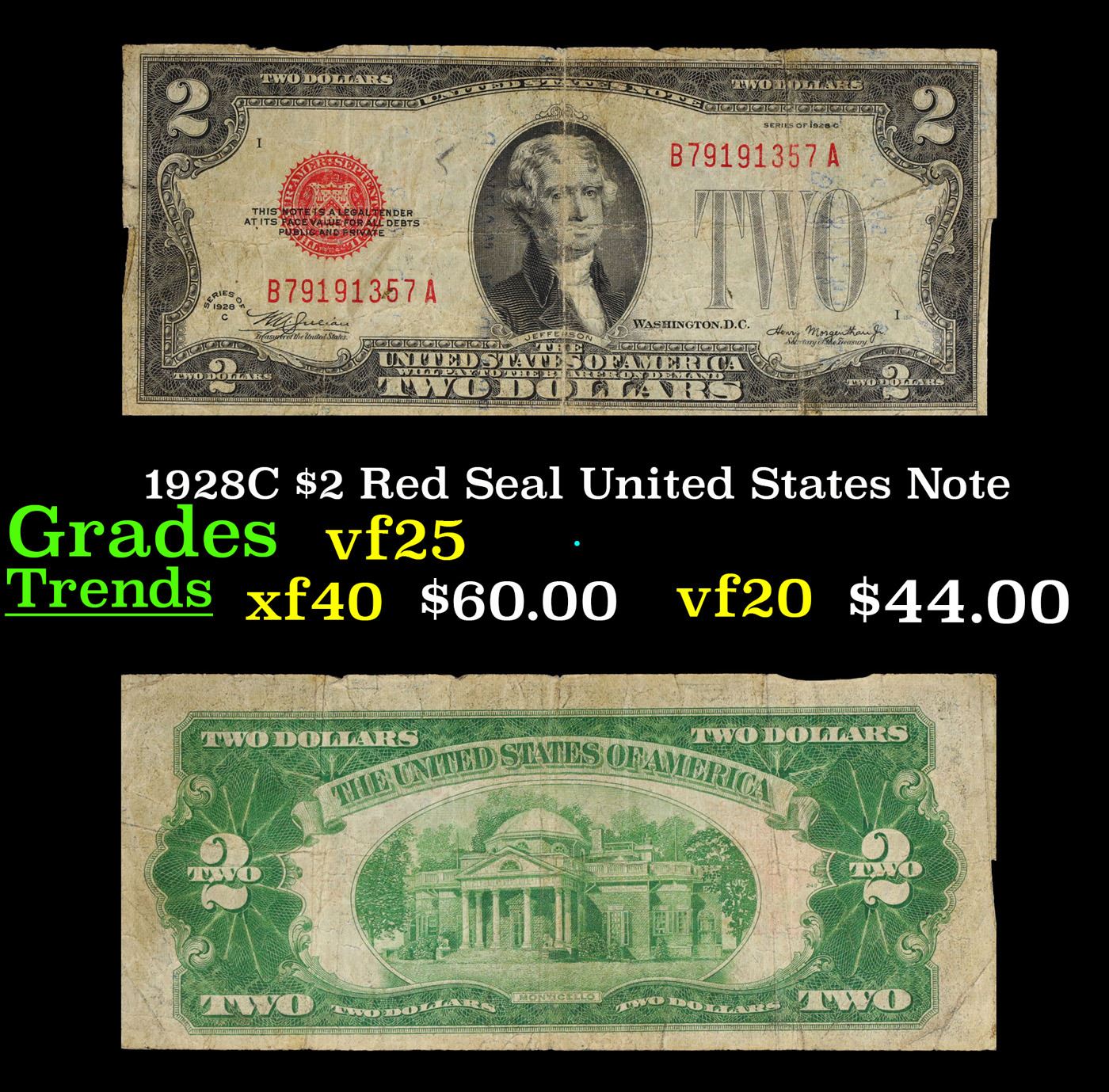 1928C $2 Red Seal United States Note Grades vf+.