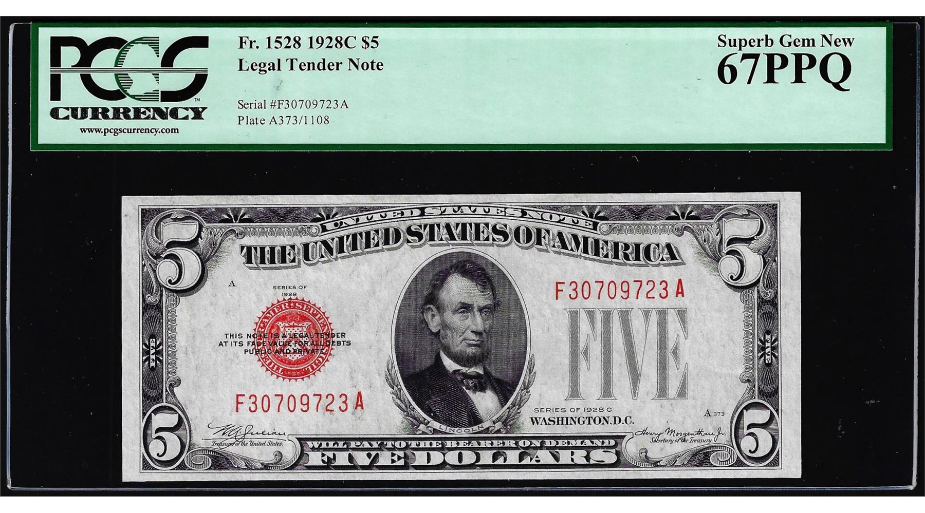 One 1928C $5 Legal Tender Note Fr.1528 PCGS Superb Gem New 67PPQ. PCGS Graded.