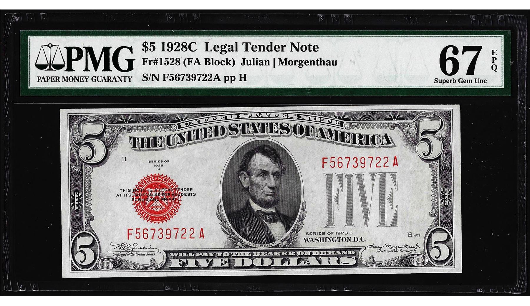 1928C $5 Legal Tender Note Fr.1528 PMG Superb Gem Uncirculated 67EPQ