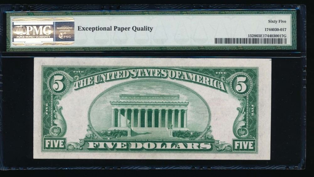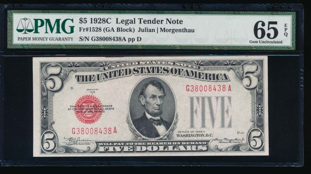 One 1928C $5 Legal Tender Note PMG 65EPQ.