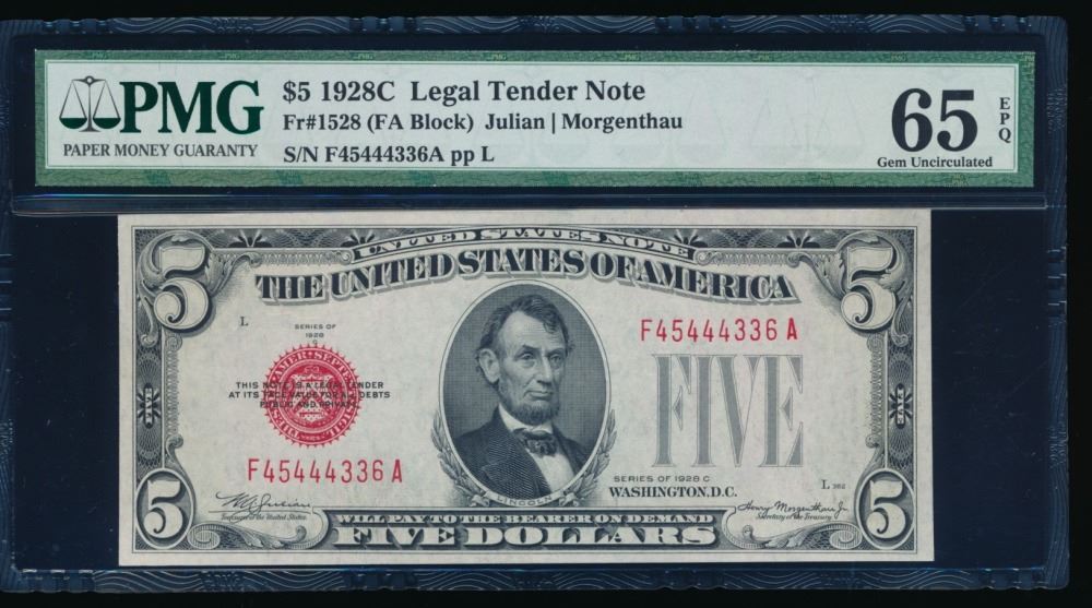 One 1928C $5 Legal Tender Note PMG 65EPQ.