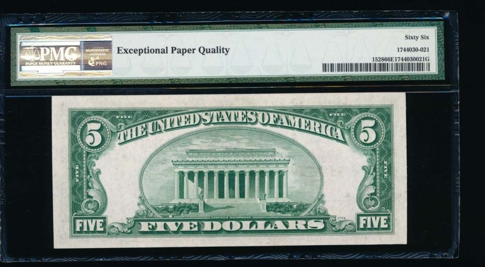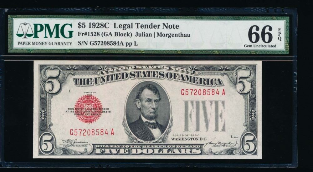 One 1928C $5 Legal Tender Note PMG 66EPQ.