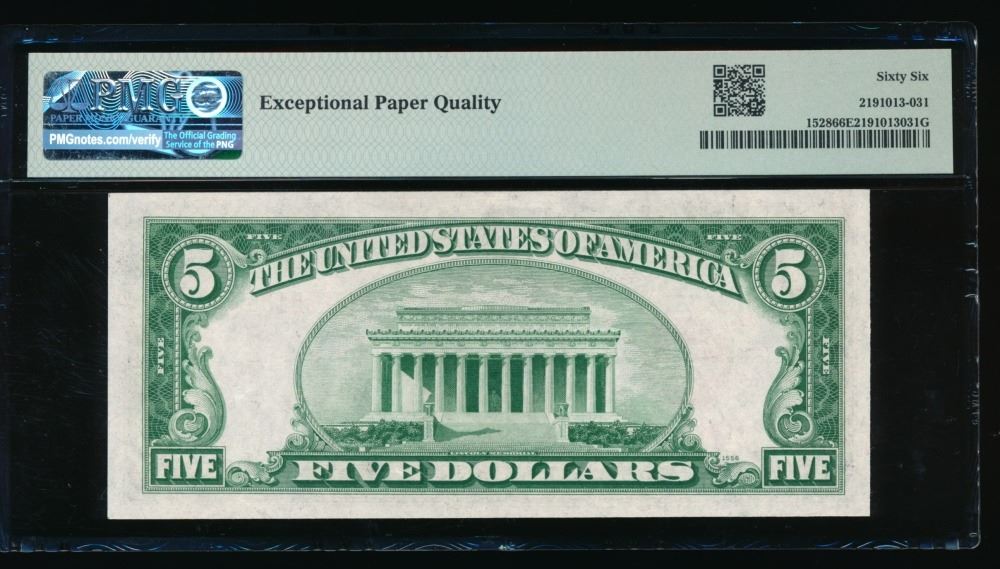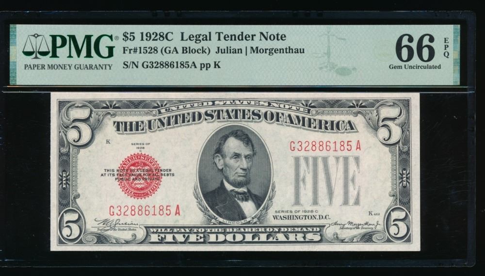 One 1928C $5 Legal Tender Note PMG 66EPQ.