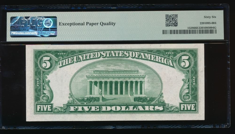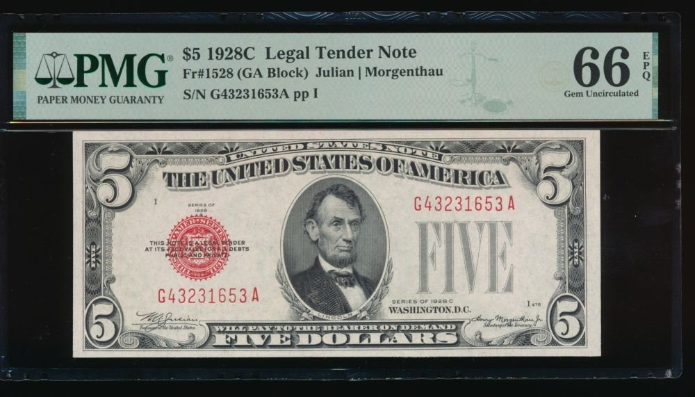 One 1928C $5 Legal Tender Note PMG 66EPQ.