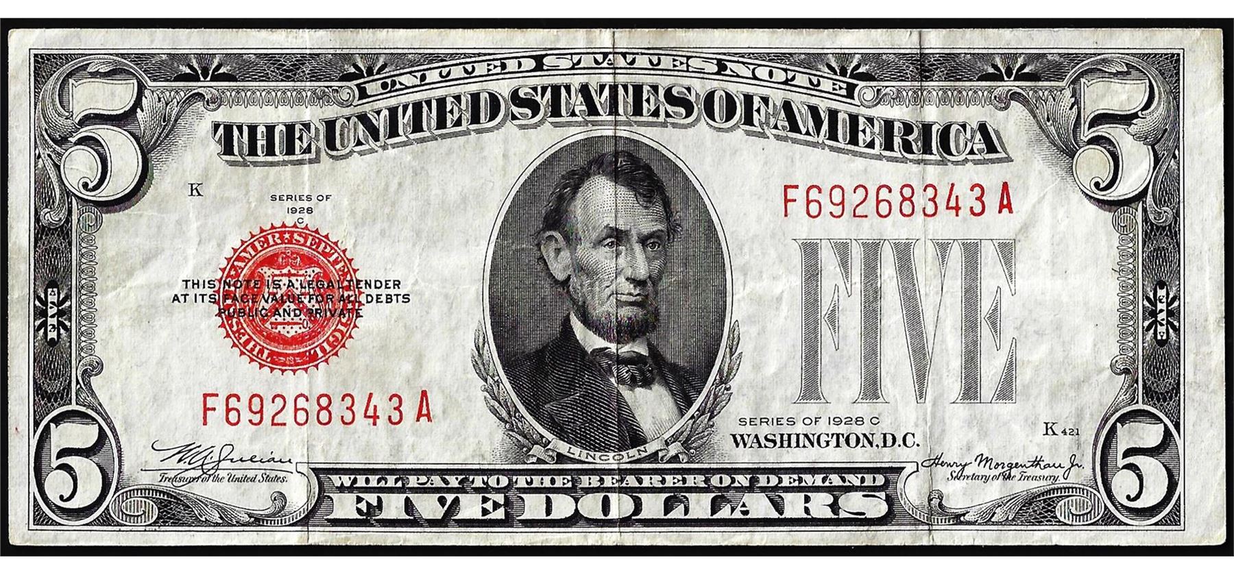 One 1928C $5 Legal Tender Red Seal Note.