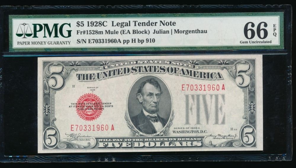 One 1928C $5 Mule Legal Tender Note PMG 66EPQ.