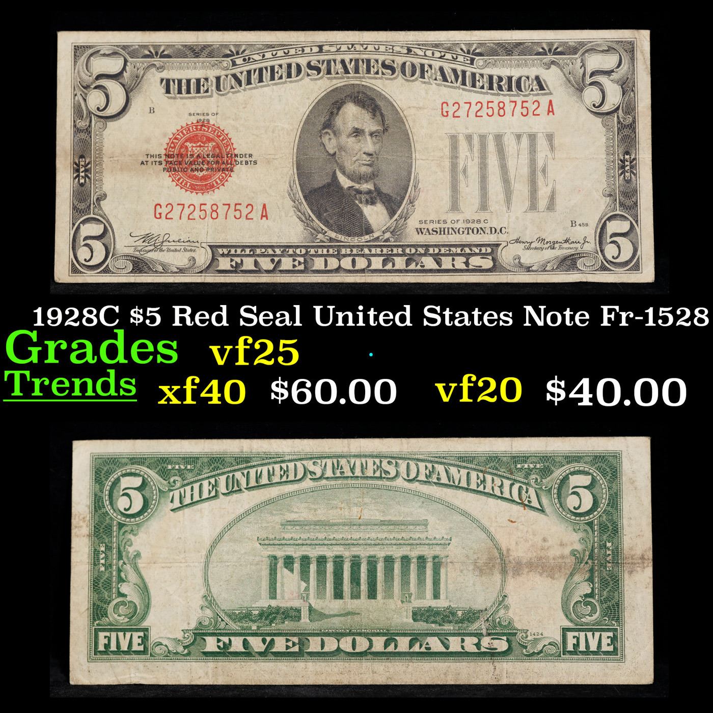 1928C $5 Red Seal United States Note Fr-1528 Grades vf+. 1928 five dollar red seals say 1928, but they were printed for many years past just 1928. 1928Fs were printed as late as the early 1950s. Some 1928 five dollar bills have different phrasings. However, all 1928 fives have a portrait of Abraham Lincoln. All bills have a red seal on the left hand side of the bill. They also have red inked writing used for the serial numbers. Signatures Julian/Morgenthau
