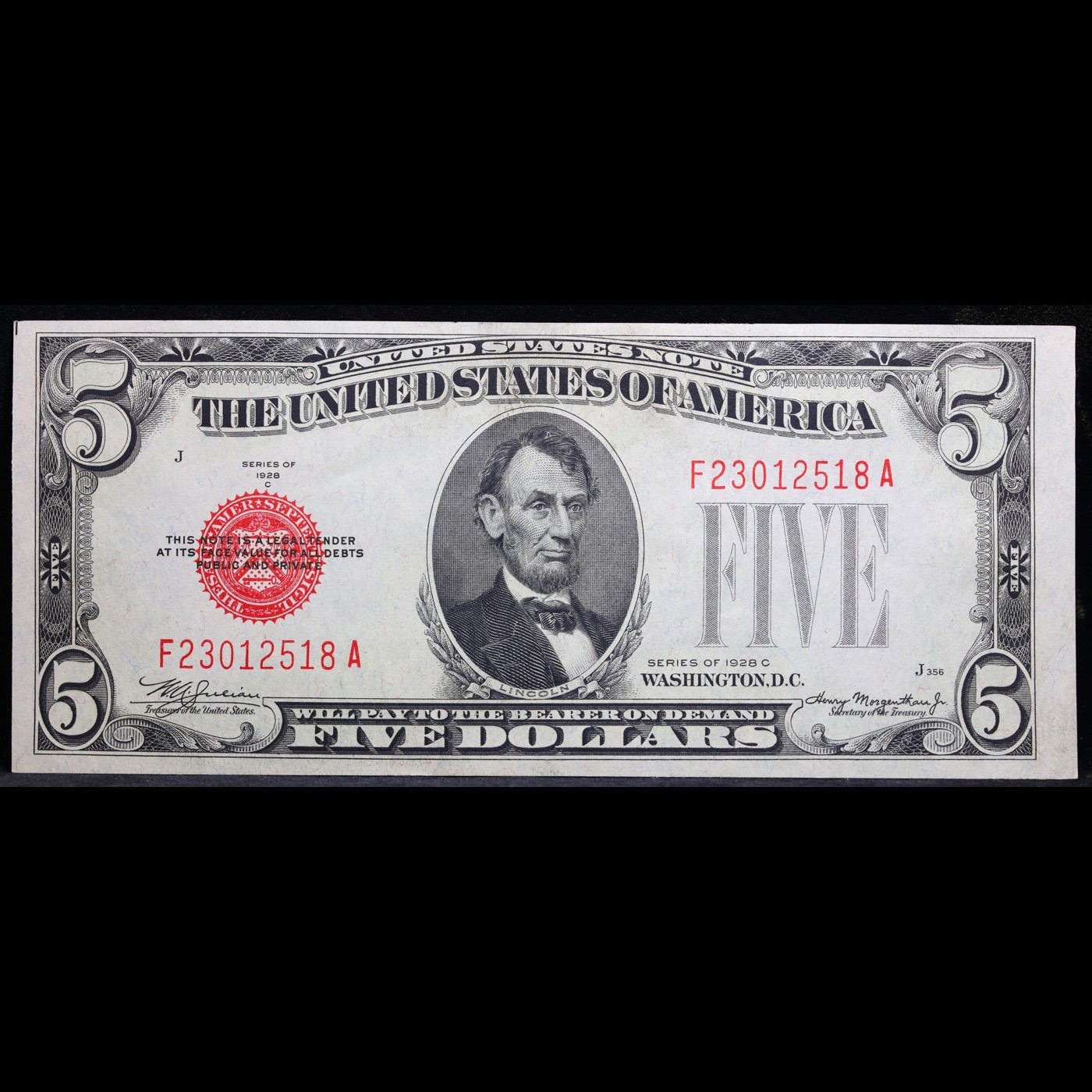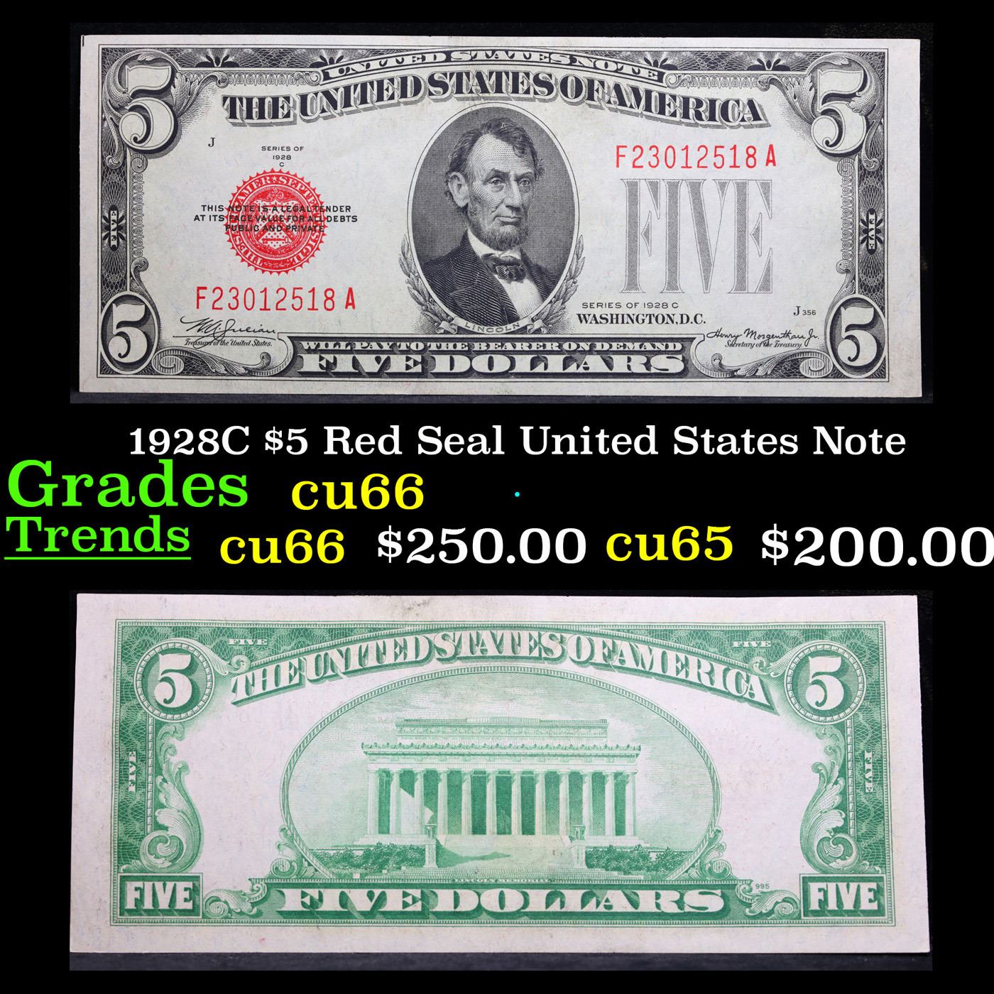 1928C $5 Red Seal United States Note Grades Gem+ CU.