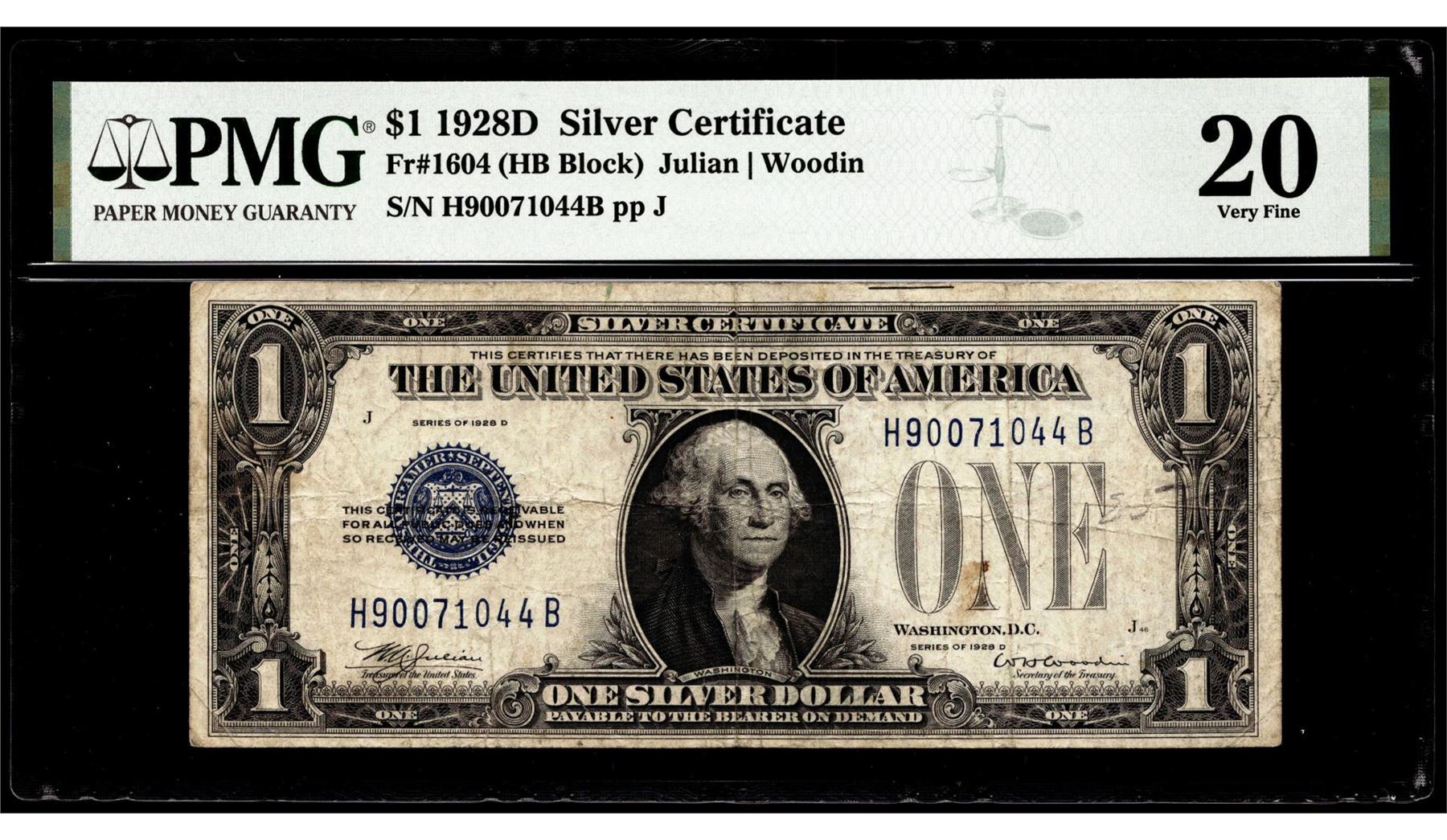 One 1928D $1 Funnyback Silver Certificate Note Fr.1604 PMG Very Fine 20. PMG Certified.
