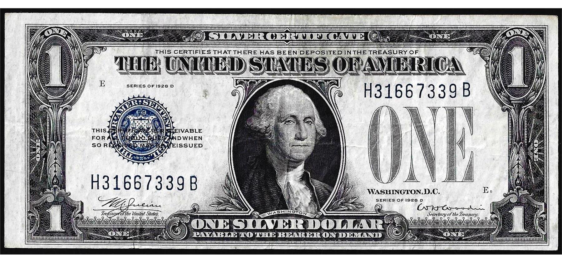 One 1928D $1 Funnyback Silver Certificate Note.