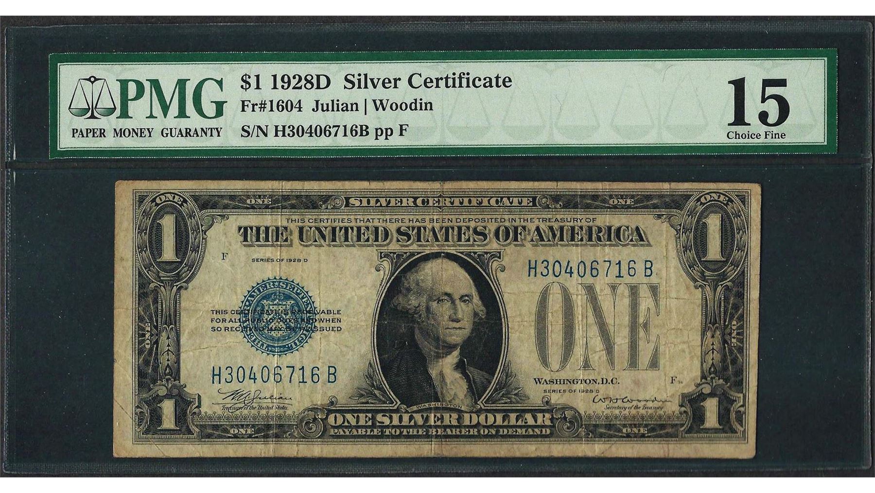 One 1928D $1 Silver Certificate Note Fr.1604 PMG Choice Fine 15. PMG Certified.