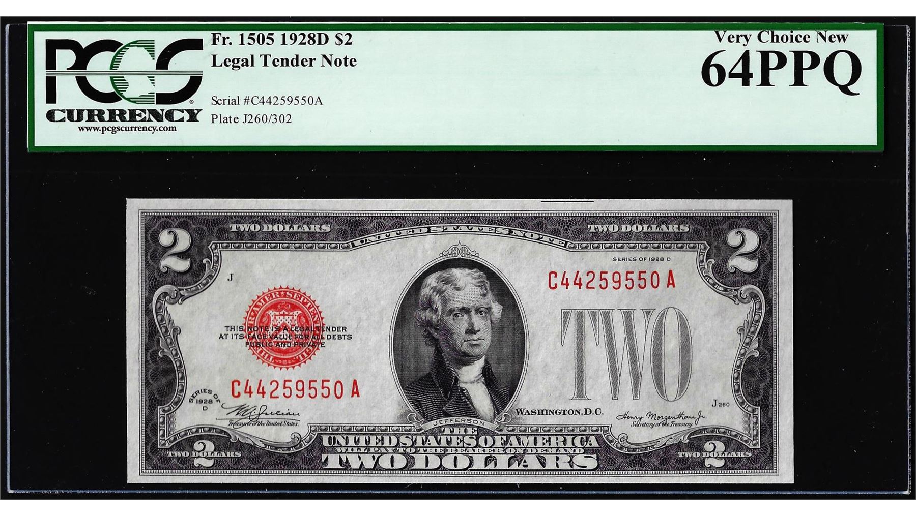 One 1928D $2 Legal Tender Note Fr.1505 PCGS Very Choice New 64PPQ. PCGS Graded.