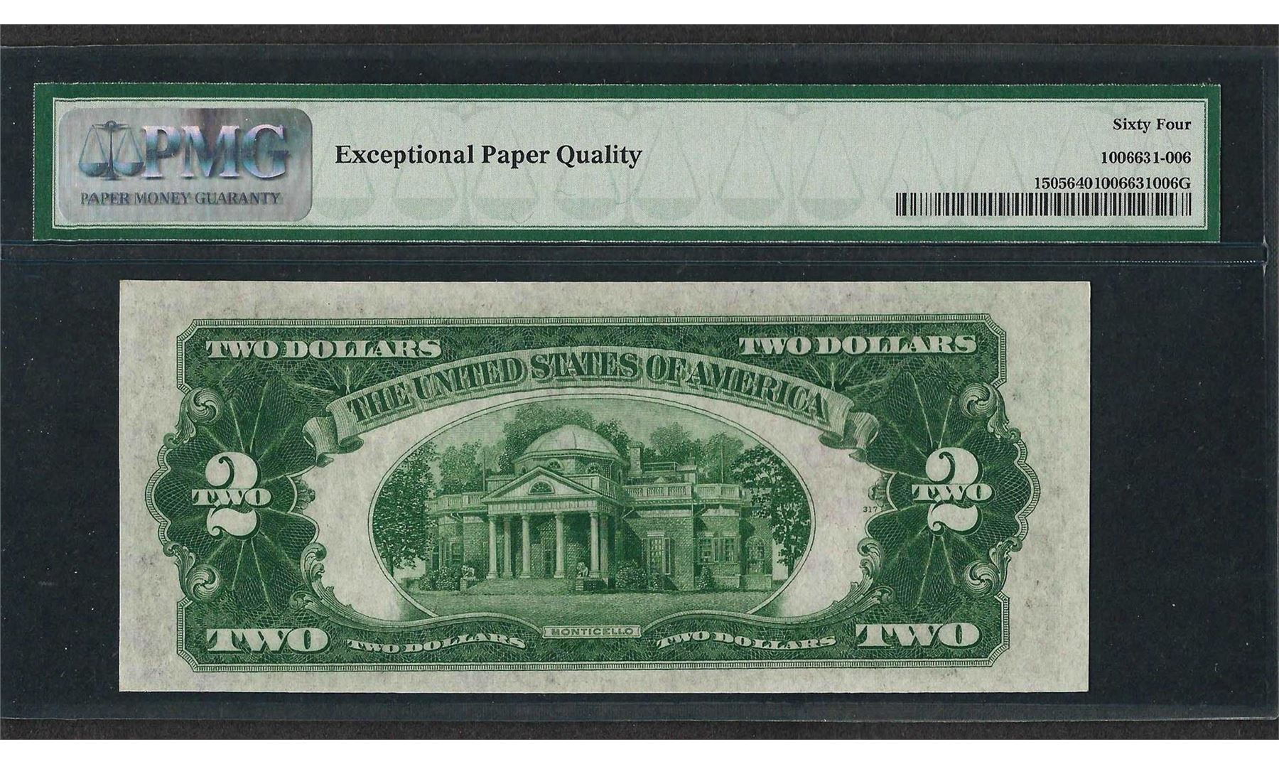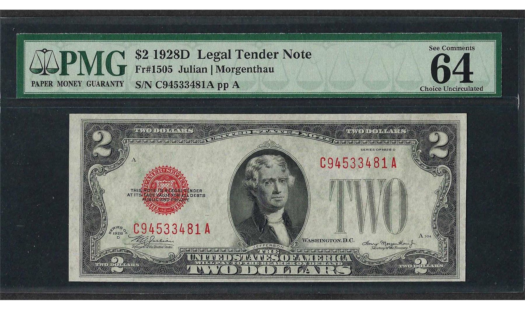 One 1928D $2 Legal Tender Note Fr.1505 PMG Choice Uncirculated 64EPQ. PMG Certified.