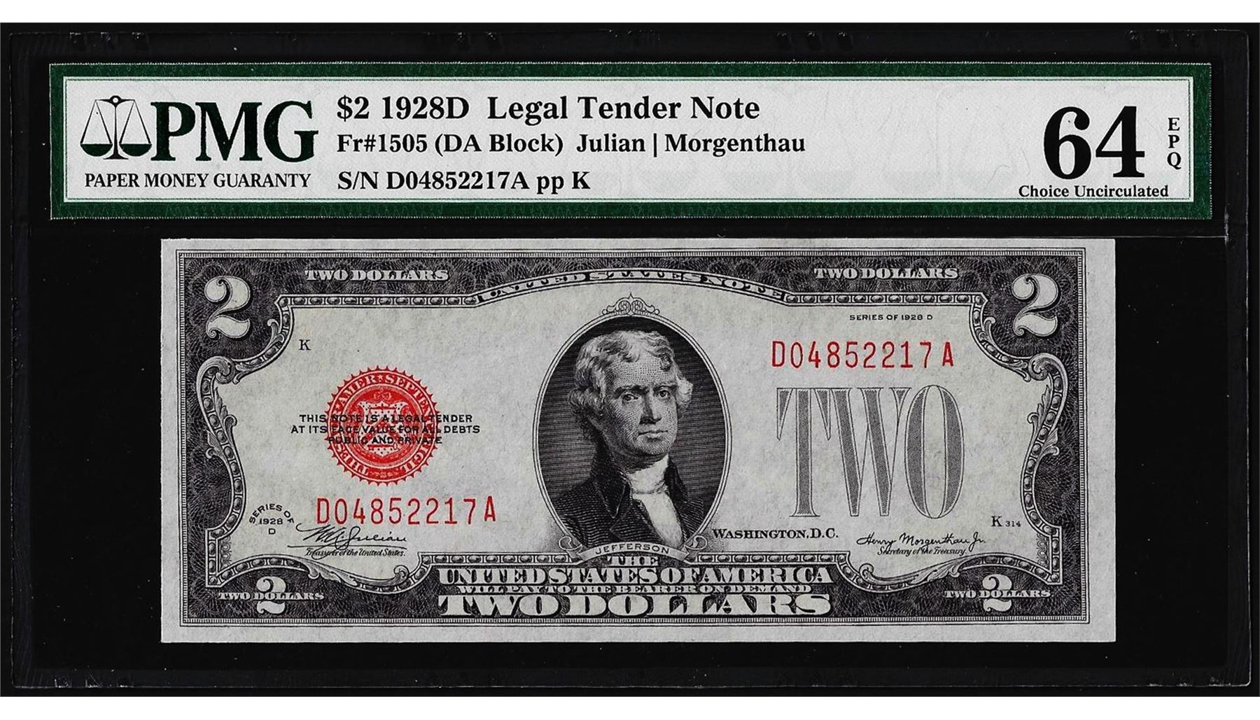 One 1928D $2 Legal Tender Note Fr.1505 PMG Choice Uncirculated 64EPQ. PMG Certified.