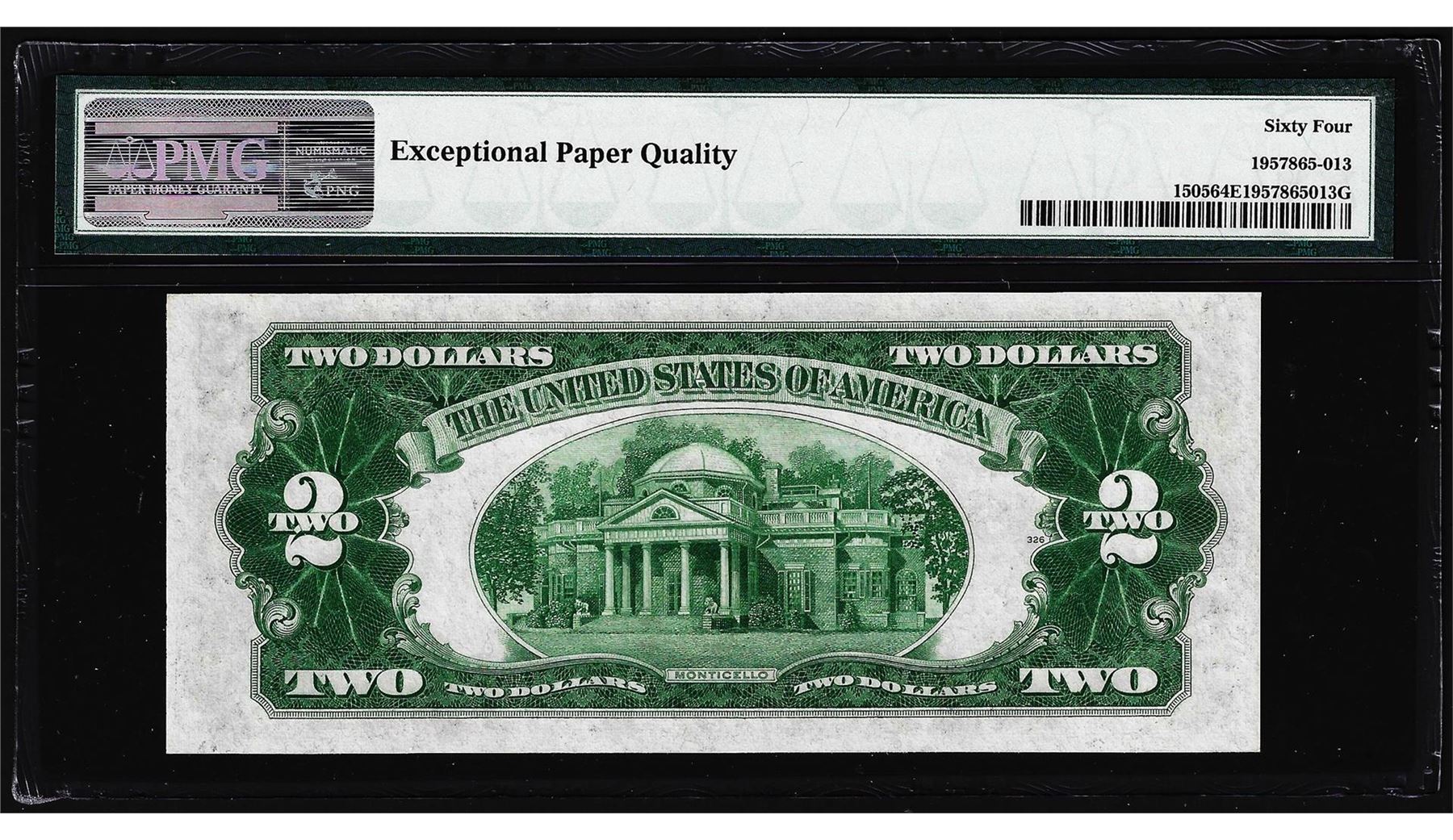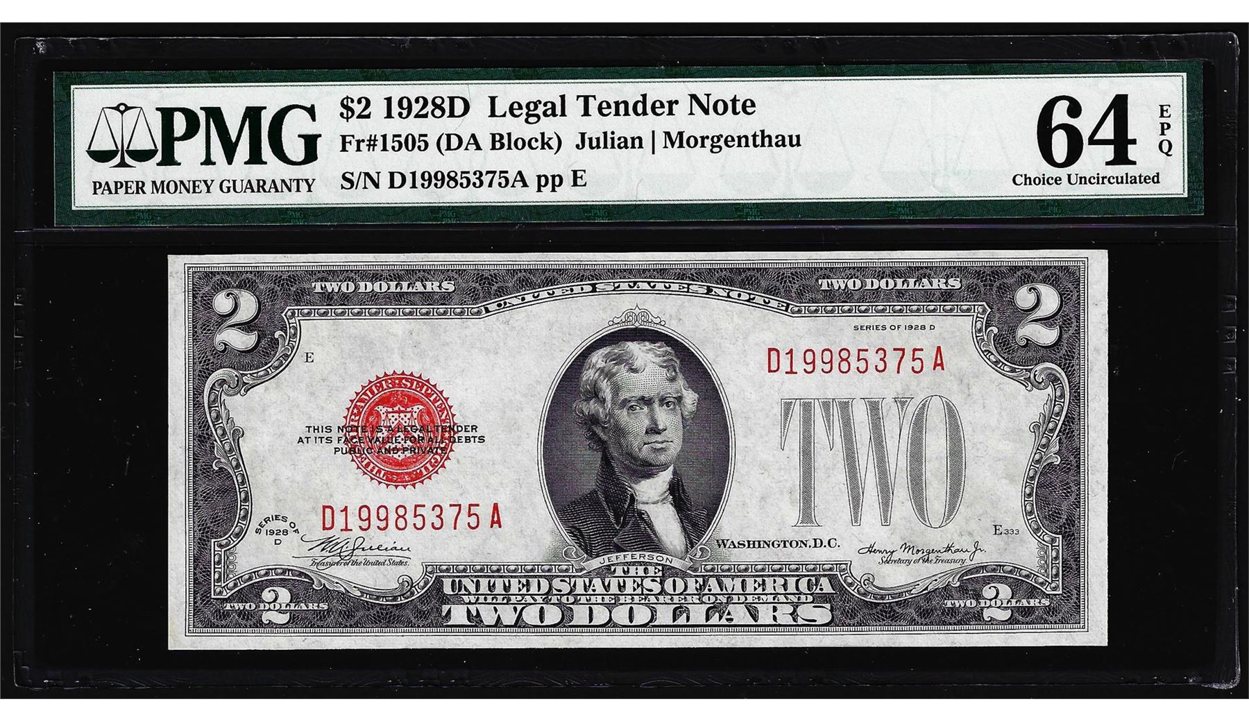 One 1928D $2 Legal Tender Note Fr.1505 PMG Choice Uncirculated 64EPQ. PMG Certified.