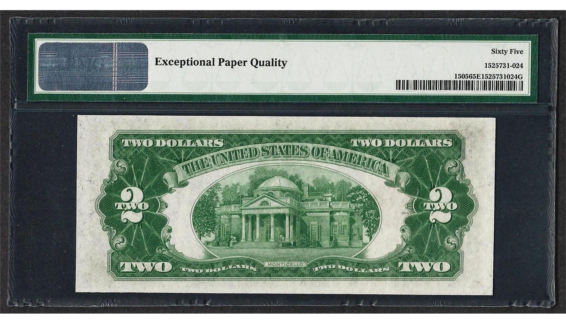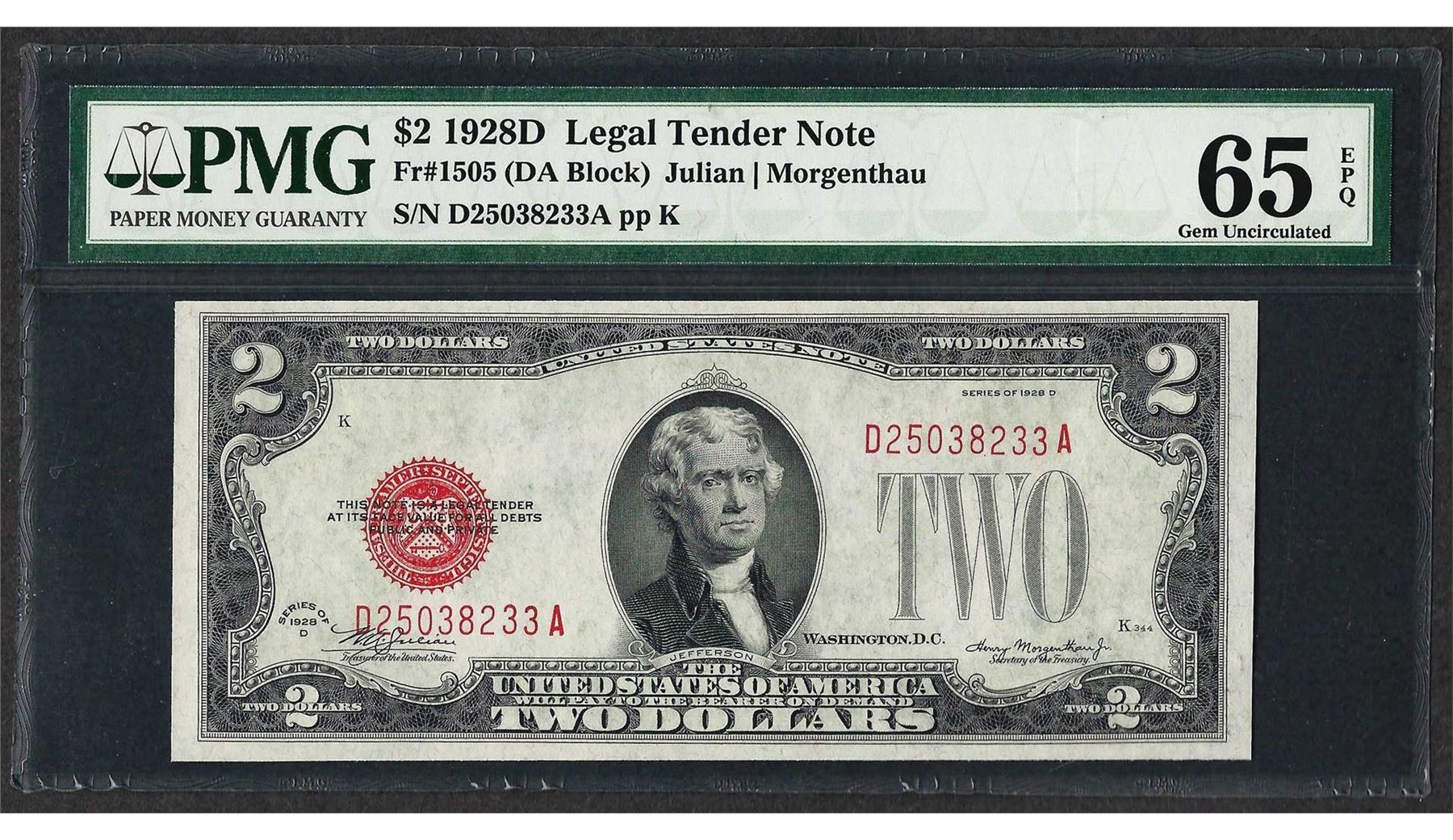 One 1928D $2 Legal Tender Note Fr.1505 PMG Gem Uncirculated 65EPQ.