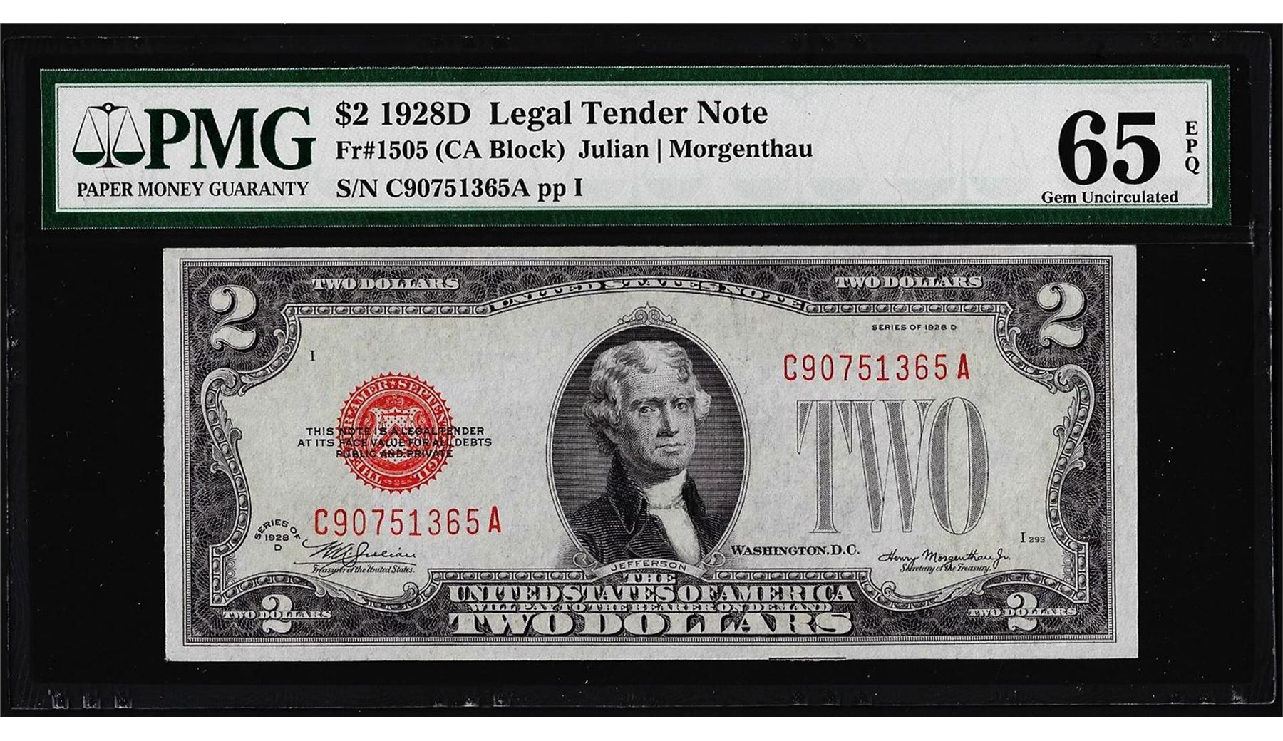 One 1928D $2 Legal Tender Note Fr.1505 PMG Gem Uncirculated 65EPQ. PMG Certified.