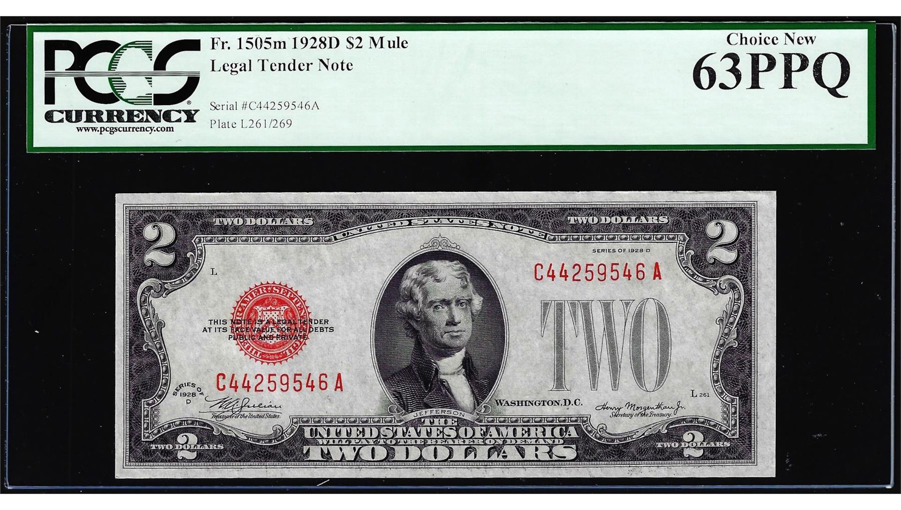One 1928D $2 Legal Tender Note Fr.1505m Mule PCGS Choice New 63PPQ. PCGS Graded.