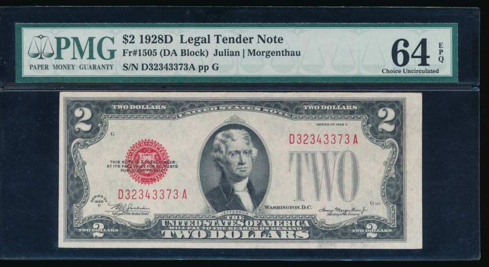 One 1928D $2 Legal Tender Note PMG 64EPQ.